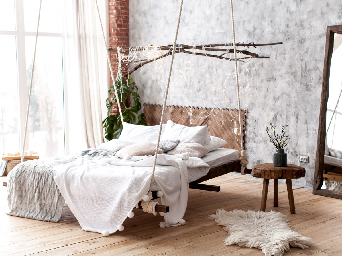 Podwieszane łóżko znakomicie sprawdza się jako mocny akcent stylistyczny. Liny z naturalnego włókna pięknie dopełniają aranżacje w stylu boho, japandi czy skandynawskim, zwłaszcza w połączeniu z jasnym drewnem i lnianymi tekstyliami. Z kolei surowe łańcuchy, stalowe obejmy i widoczne kotwy w stropie podkreślą loftowy charakter wnętrza, nawiązując do przemysłowych hal i starych fabryk. Jedna konstrukcja, a zupełnie różne efekty wizualne.