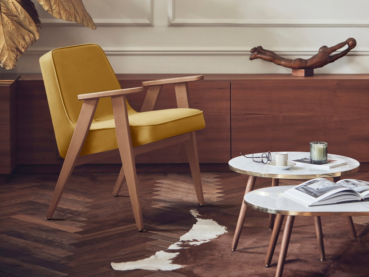 Na początku lat 60. projektant Józef Chierowski stworzyłfotel 366 – lekki, nowoczesny i zupełnie odmienny od masywnych mebli sprzed wojny, które wciąż można było znaleźć w ówczesnych domach. Model szybko stał się jednym z największych hitów PRL-u, produkowanym aż do lat 80. W2014 roku do życia przywróciła go marka 366 Concept, uzyskując wyłączną licencję na jego produkcję oraz na inne klasyki z epoki (na sąsiedniej stronie reprodukcja oryginału w musztardowej tapicerce). Dzisiejsze wersje fotela proponowane przez producenta pozostają wierne oryginałowi, jednocześnie oferując jego różnorodne wykończenia. W sklepach znajdziemy fotele w podobnej stylistyce, oferowane także przez innych wytwórców.