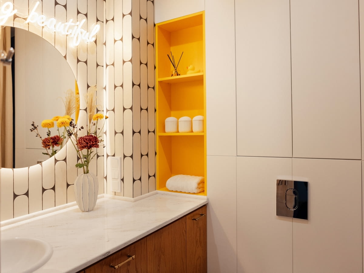 W łazience największy potencjał przechowywania kryje się w strefach instalacyjnych. Zabudowa nad stelażem WC, szafki lustrzane o odpowiedniej głębokości, wnęki w strefie prysznica oraz zabudowy nad pralką pozwalają uporządkować kosmetyki i akcesoria. Zamiast ustawiania przedmiotów na krawędziach ceramiki, korzystniejsze pozostaje przewidzenie zamkniętych modułów lub wnęk wykończonych materiałami odpornymi na wilgoć. W tej strefie szczególnie istotny jest dobór okuć i materiałów umożliwiających regularne czyszczenie bez ryzyka uszkodzeń.