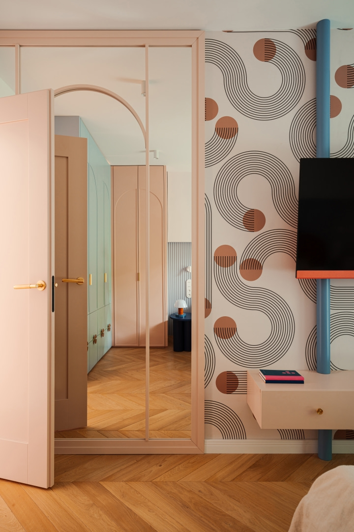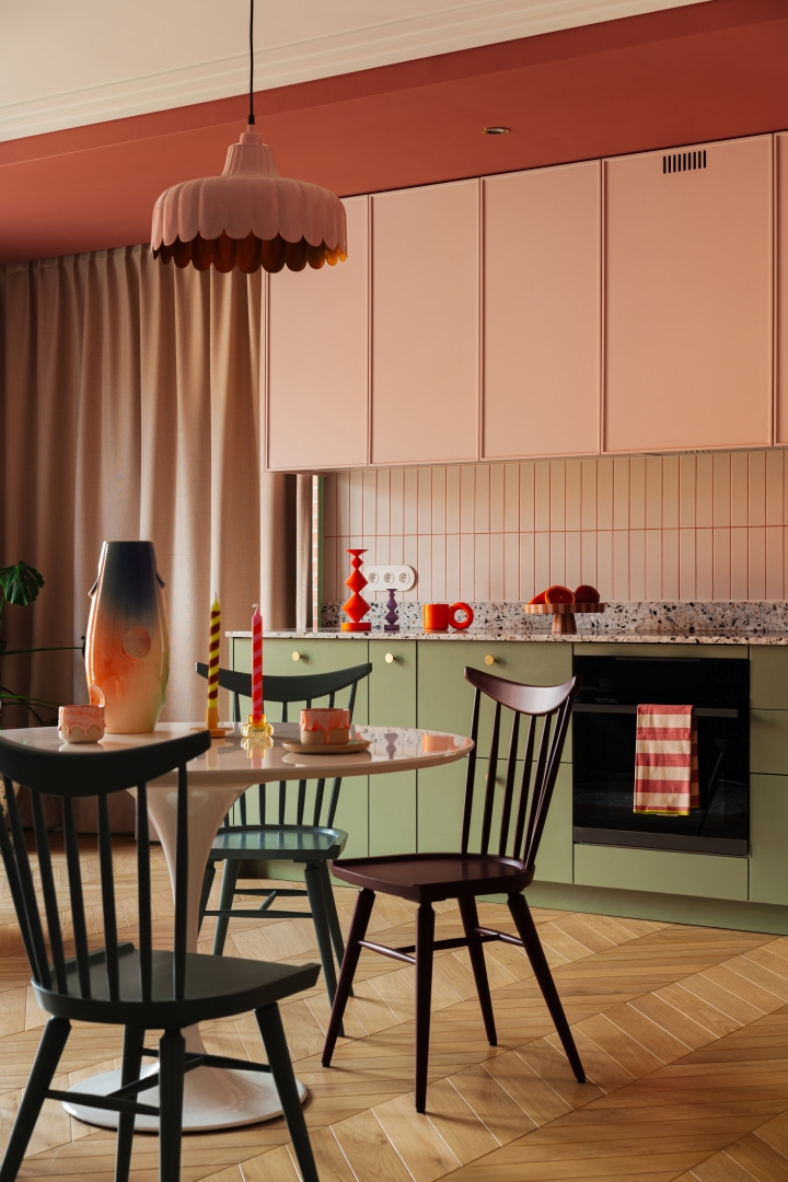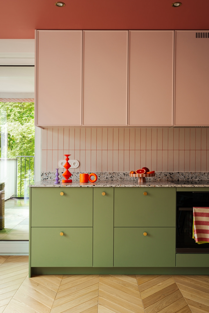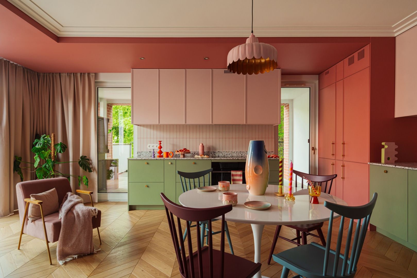 W samym sercu Krakowa powstało mieszkanie zaprojektowane dla pary entuzjastów nowoczesnej sztuki i stylistyki filmowej, a zwłaszcza estetyki kina Wesa Andersona. Projekt idealnie odpowiada na wymagania właścicieli. Wnętrza są intensywne, funkcjonalne i pełne unikalnych rozwiązań, ale przy tym przytulne i sprzyjające odpoczynkowi. Aranżacja, pełna odniesień do stylu vintage i ikon polskiego designu, jest doskonałym przykładem harmonii między nowoczesnością a klasyką. W wyrazistych wnętrzach dominują pastelowe odcienie, szczególnie różowego oraz mnogość geometrycznych kształtów i nietuzinkowych połączeń. Każdy detal został starannie przemyślany i dobrany, od kafli lastryko, przez blaty, po doniczki. W tym wnętrzu nic nie jest przypadkowe, nawet kubki na kawę, młynki czy dzbaneczki.