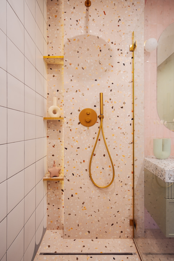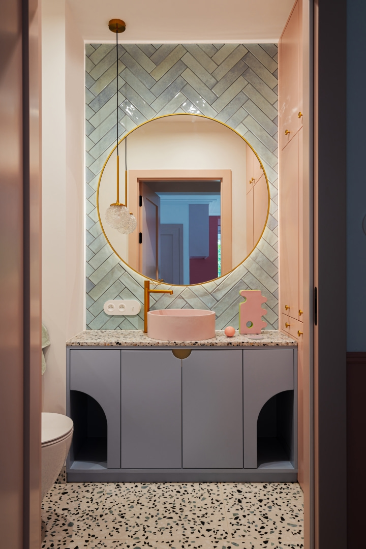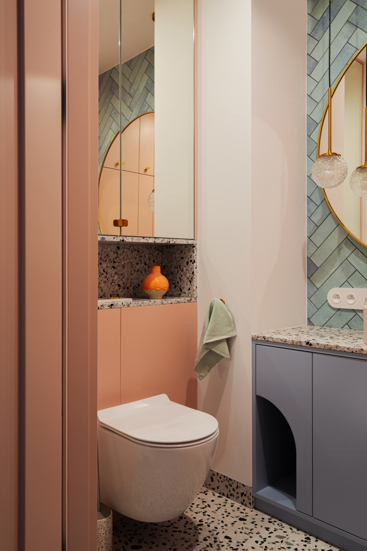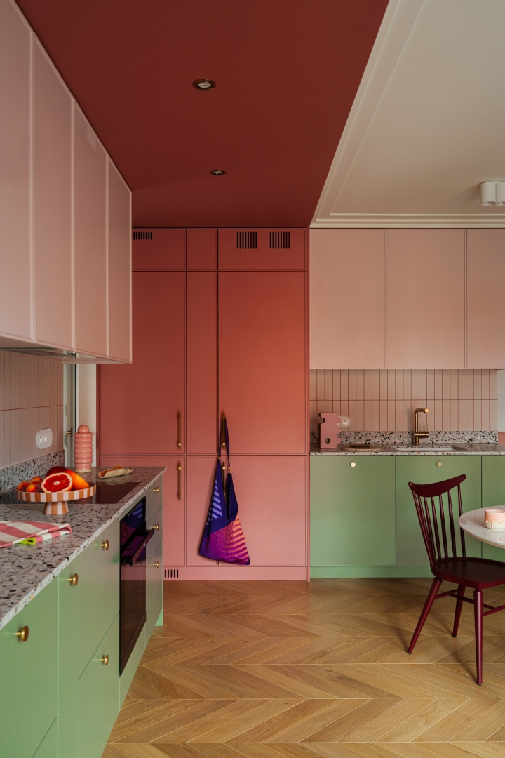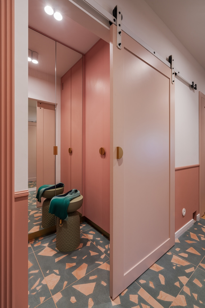 W samym sercu Krakowa powstało mieszkanie zaprojektowane dla pary entuzjastów nowoczesnej sztuki i stylistyki filmowej, a zwłaszcza estetyki kina Wesa Andersona. Projekt idealnie odpowiada na wymagania właścicieli. Wnętrza są intensywne, funkcjonalne i pełne unikalnych rozwiązań, ale przy tym przytulne i sprzyjające odpoczynkowi. Aranżacja, pełna odniesień do stylu vintage i ikon polskiego designu, jest doskonałym przykładem harmonii między nowoczesnością a klasyką. W wyrazistych wnętrzach dominują pastelowe odcienie, szczególnie różowego oraz mnogość geometrycznych kształtów i nietuzinkowych połączeń. Każdy detal został starannie przemyślany i dobrany, od kafli lastryko, przez blaty, po doniczki. W tym wnętrzu nic nie jest przypadkowe, nawet kubki na kawę, młynki czy dzbaneczki.