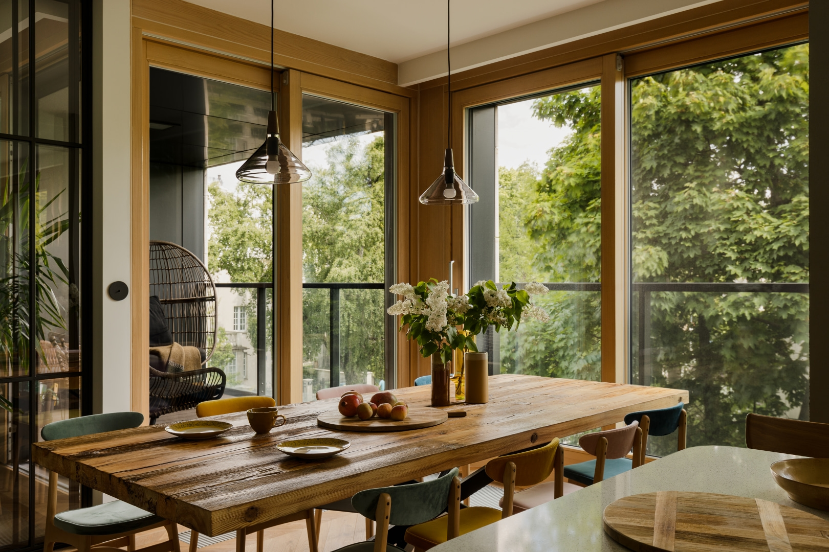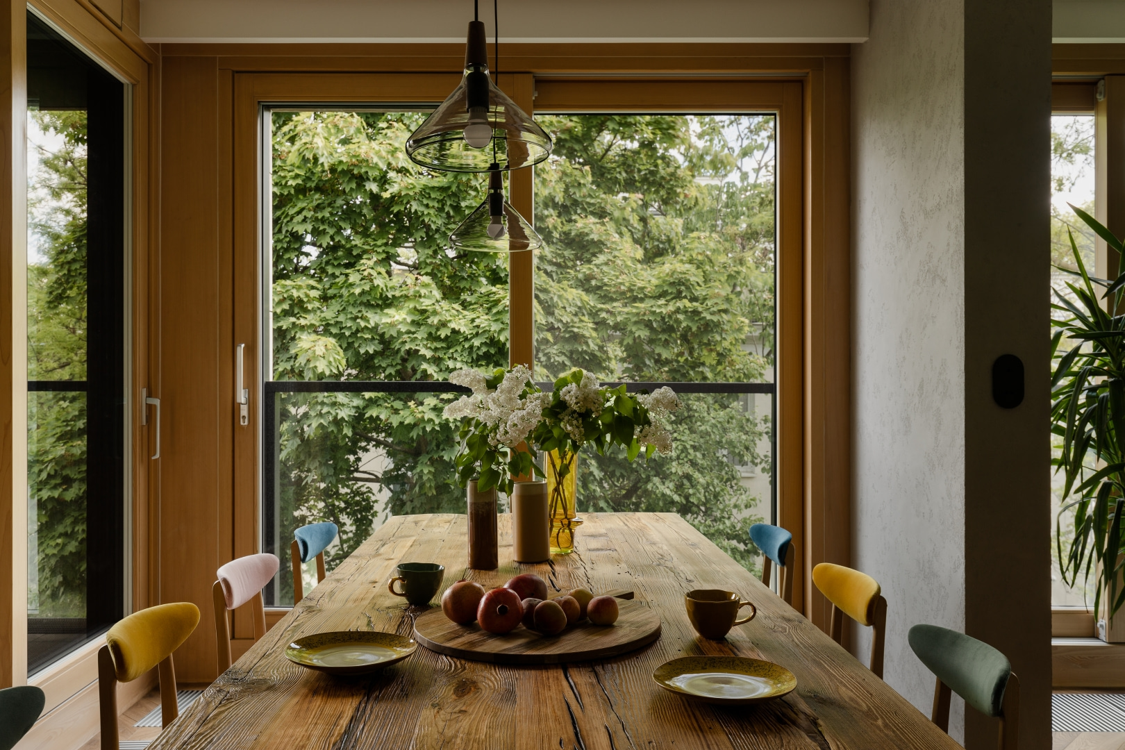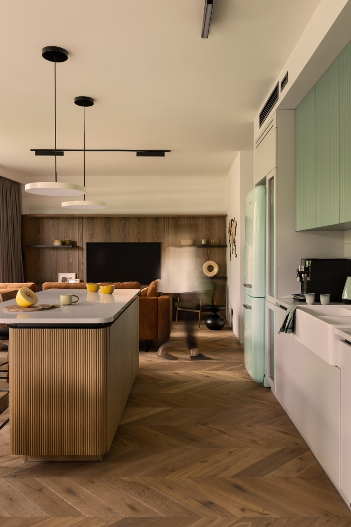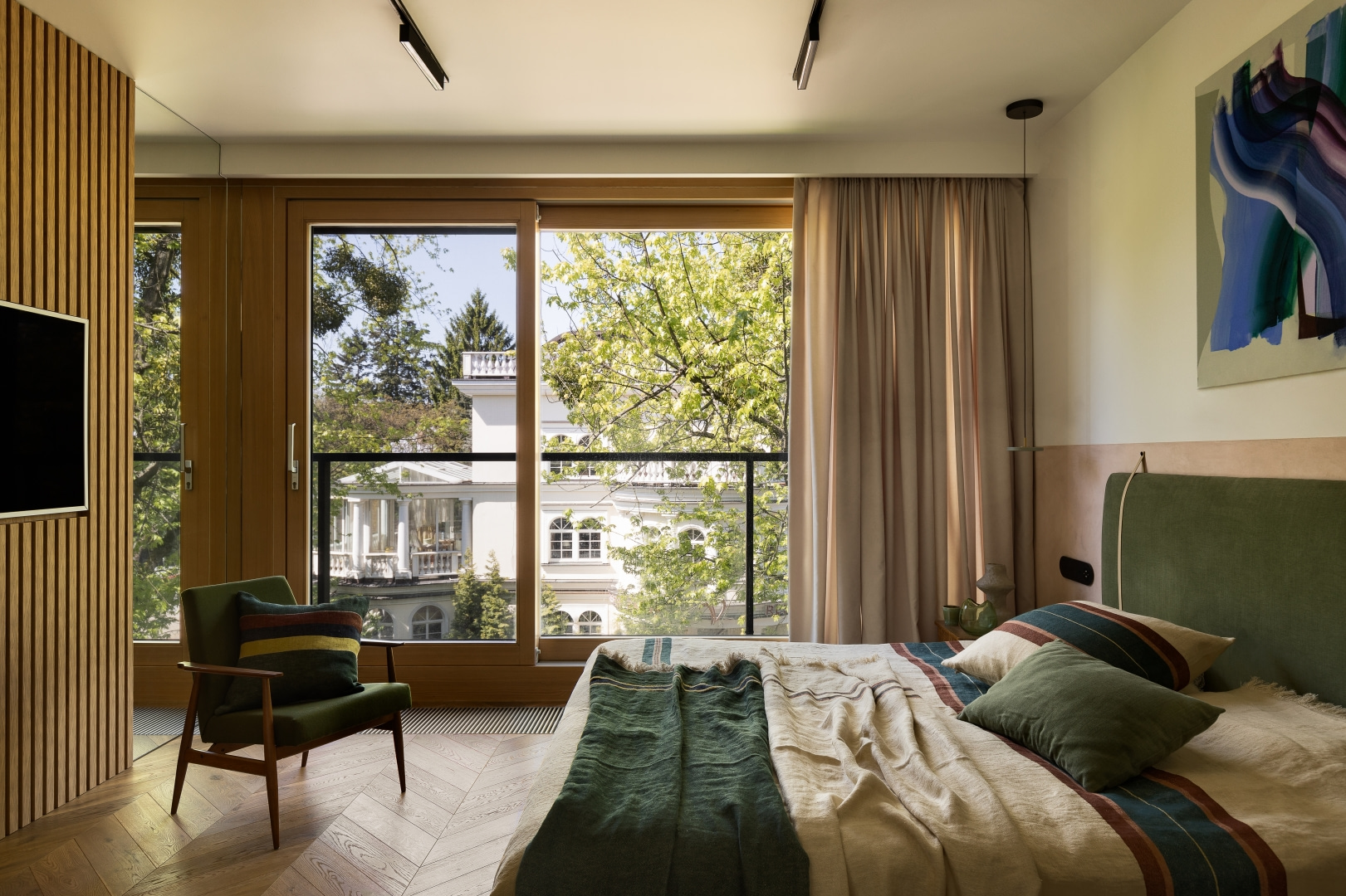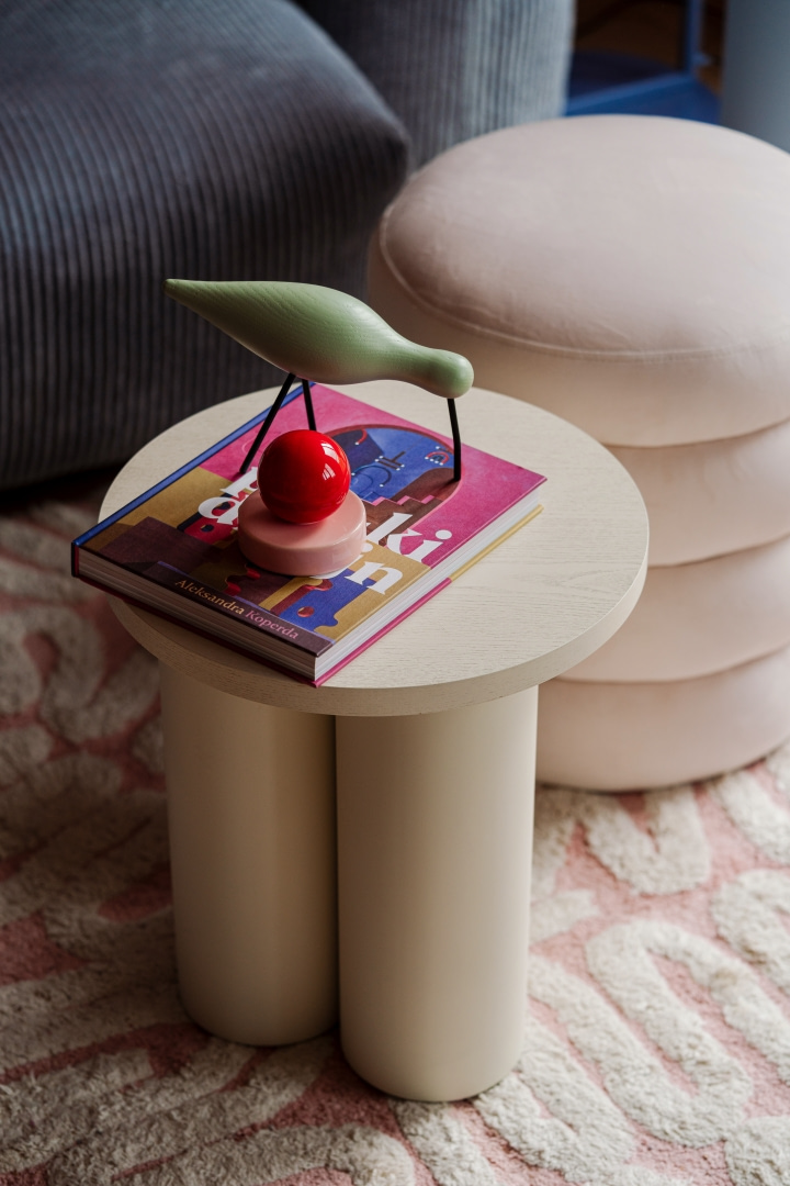 Właściciele warszawskiego apartamentu z widokiem na pałacyk od początku byli otwarci na ciekawe i kolorowe rozwiązania. W przestrzeni zakomponowano elementy vintage, jak chociażby odnowione krzesła z PRL-u Hałasy, które miały nawiązywać do barw w całym mieszkaniu. W projekcie znalazły się też obłe, organiczne kształty, które w połączeniu z drewnem oraz roślinami tworzą domowy klimat. Siłą wnętrza jest detal. W kuchni ryflowane fronty dobrano pod kolor lodówki Smeg i zestawiono z konglomeratem lastryko na blacie. Delikatnego pazura dodają czarne elementy przewijające się w całym mieszkaniu, takie jak osprzęt elektryczny czy baterie. W sypialni wyróżnia się różowy tynk strukturalny, a w przedpokoju na posadzce mikrocement. Każde pomieszczenie ma swój niepowtarzalny klimat, a przy tym wszystkie razem tworzą integralną całość.