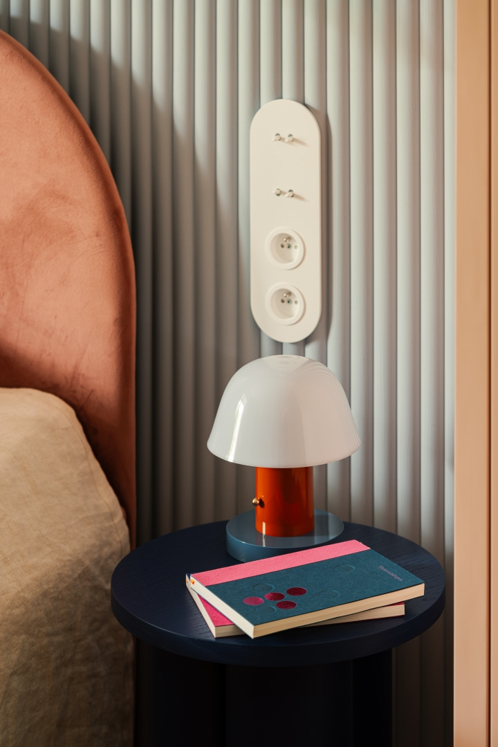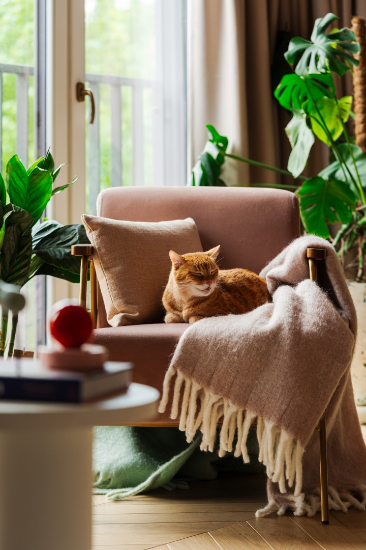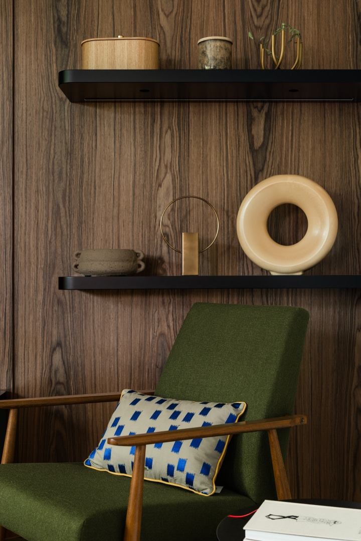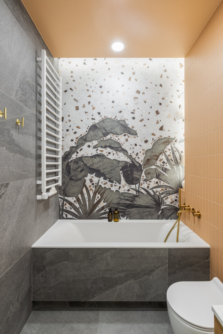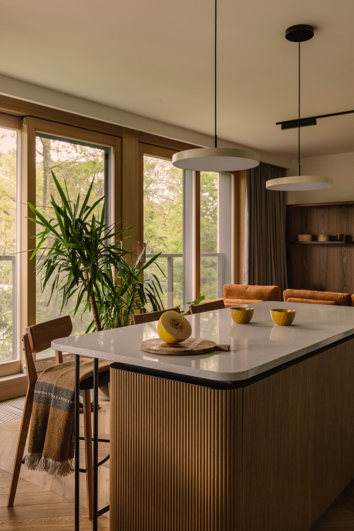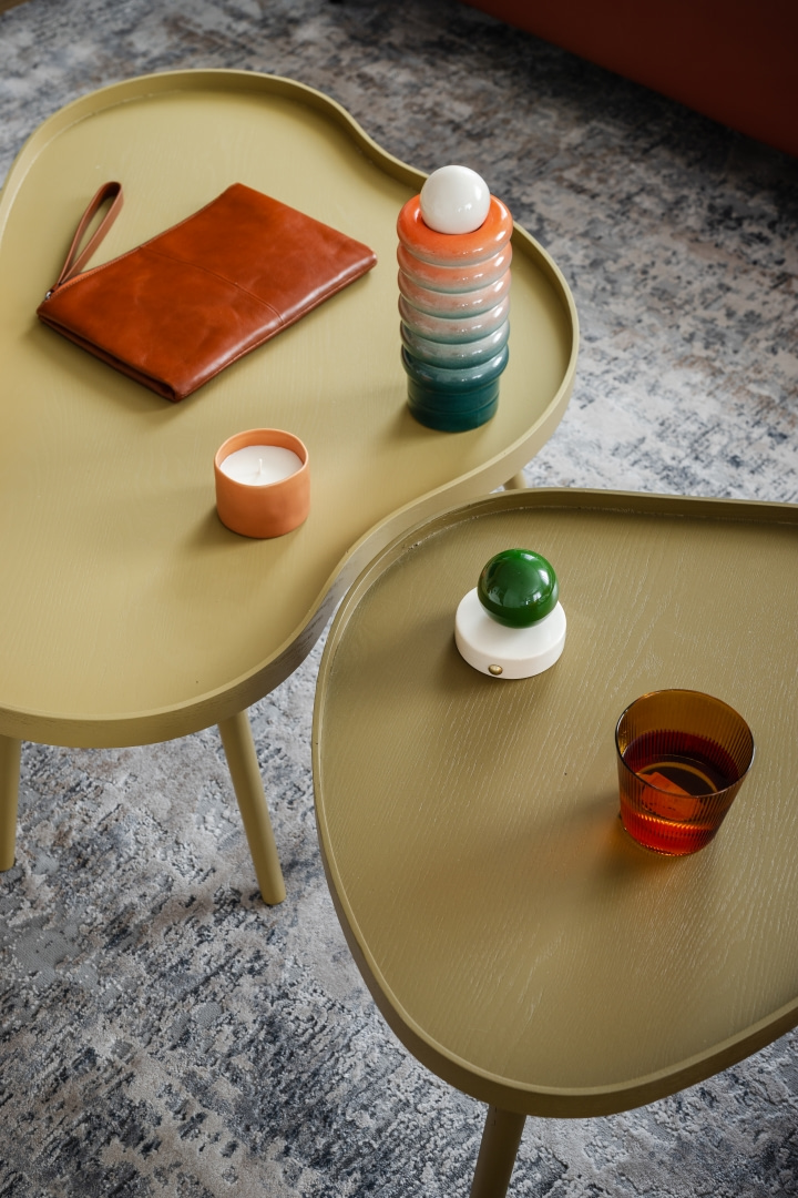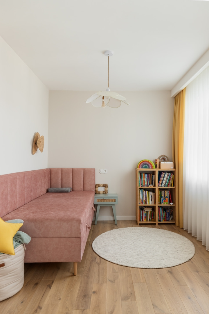 Właściciele warszawskiego apartamentu z widokiem na pałacyk od początku byli otwarci na ciekawe i kolorowe rozwiązania. W przestrzeni zakomponowano elementy vintage, jak chociażby odnowione krzesła z PRL-u Hałasy, które miały nawiązywać do barw w całym mieszkaniu. W projekcie znalazły się też obłe, organiczne kształty, które w połączeniu z drewnem oraz roślinami tworzą domowy klimat. Siłą wnętrza jest detal. W kuchni ryflowane fronty dobrano pod kolor lodówki Smeg i zestawiono z konglomeratem lastryko na blacie. Delikatnego pazura dodają czarne elementy przewijające się w całym mieszkaniu, takie jak osprzęt elektryczny czy baterie. W sypialni wyróżnia się różowy tynk strukturalny, a w przedpokoju na posadzce mikrocement. Każde pomieszczenie ma swój niepowtarzalny klimat, a przy tym wszystkie razem tworzą integralną całość.