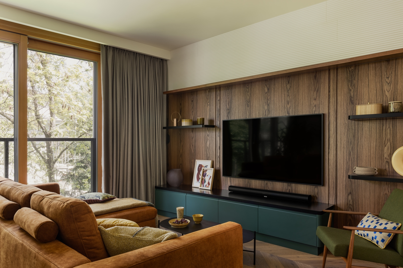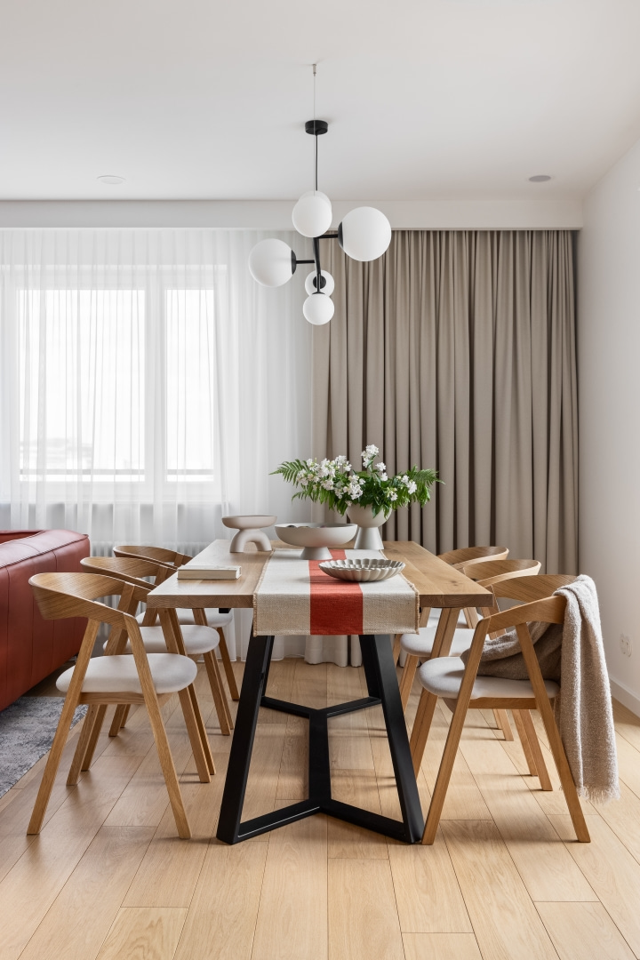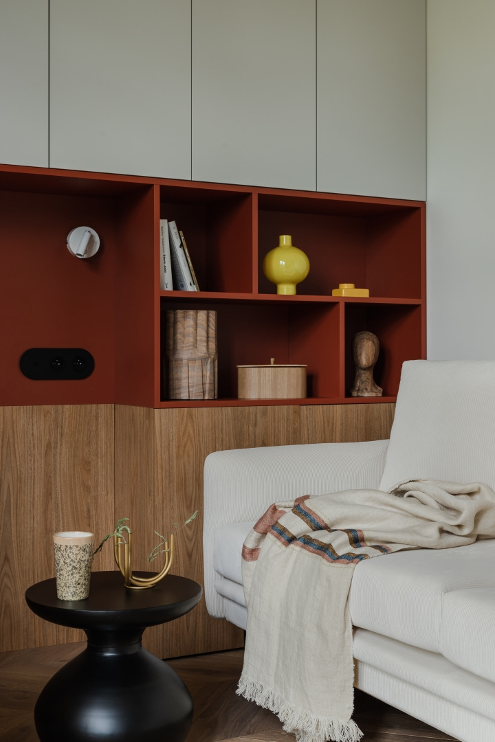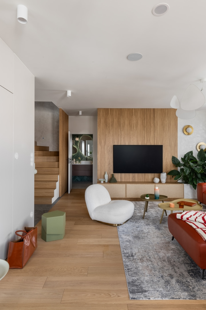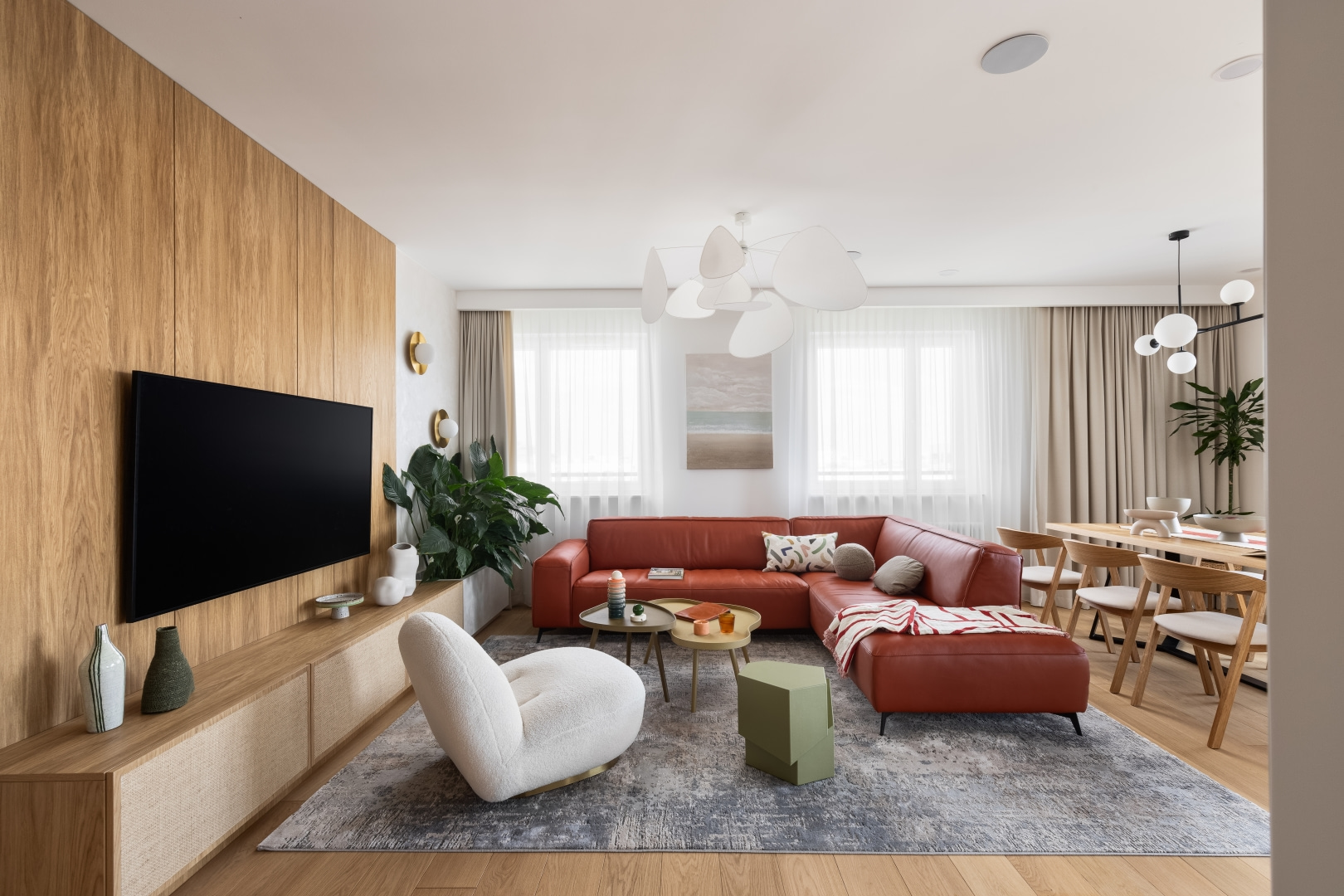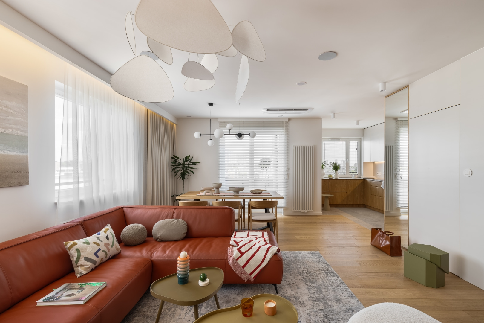 Wnętrza zaprojektowanego dla rodziny 2+1, dwupoziomowego mieszkania to harmonijne połączenie wyrazistości, przytulności i nowoczesności. Zestawienie spokojnej bazy japandi ze zdecydowanymi akcentami kolorystycznymi tworzy inspirujący, eklektyczny efekt. Czerwono-ruda kanapa w strefie dziennej staje się centralnym punktem, przyciągającym uwagę i nadającym wnętrzu wyrazu. Organiczne kształty stolików kawowych i luster dodają naturalności i lekkości, a ściana TV z forniru i tynku strukturalnego wraz z roślinnością prezentuje się jako nowoczesny, charakterystyczny element wystroju. Ideą projektu był uzyskanie kontrastu pomiędzy prostą i stonowaną strefą dzienną, a zamkniętymi pomieszczeniami, które miały wprowadzać energię oraz zaskakiwać swoimi kolorami.