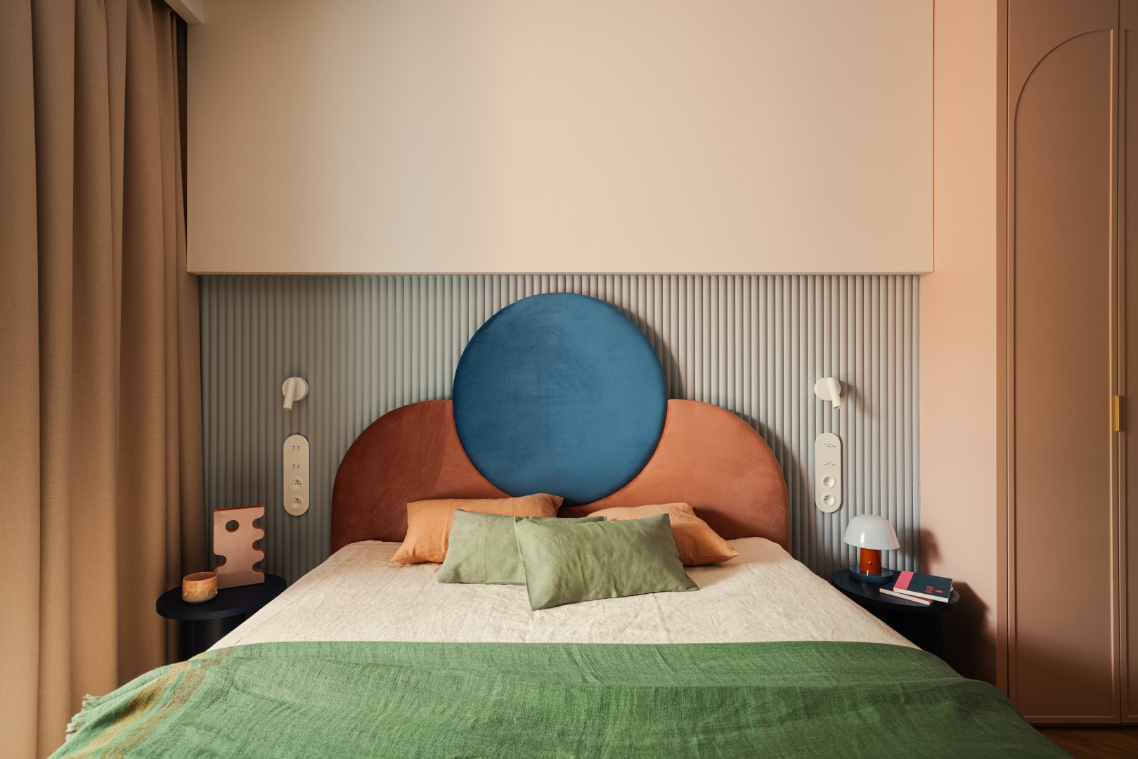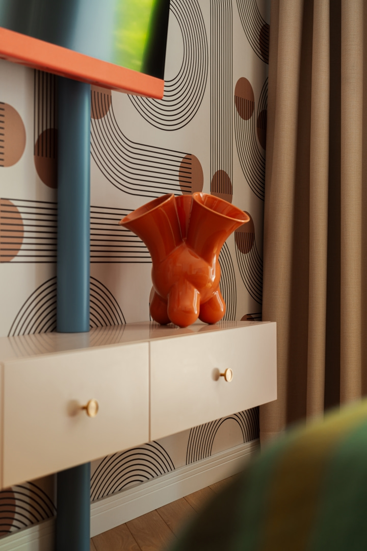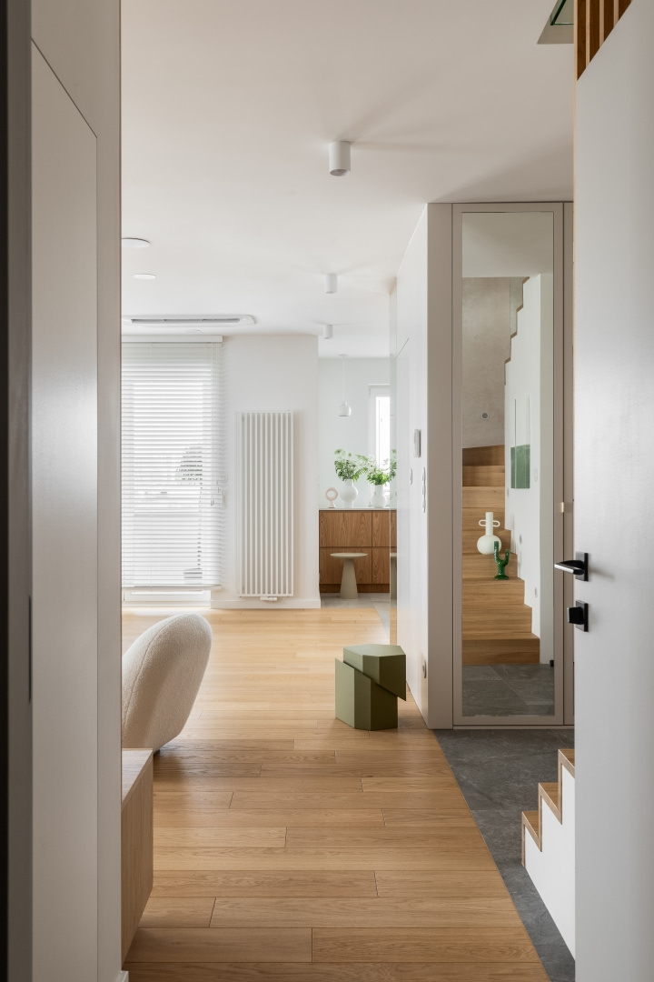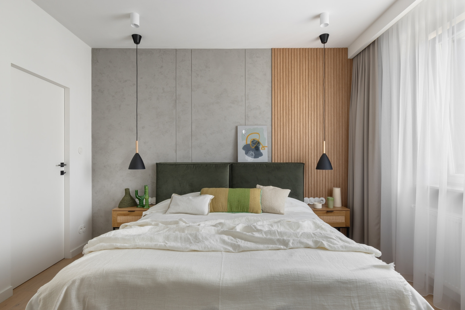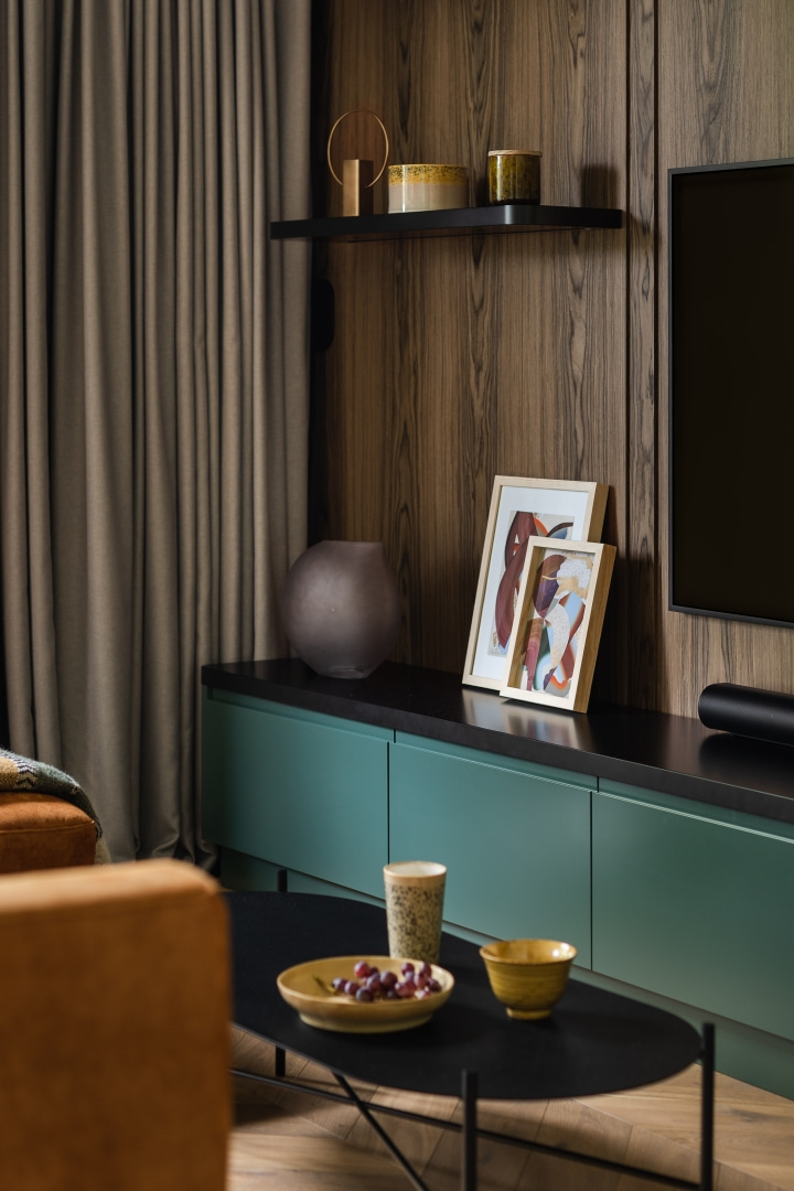 Wnętrza zaprojektowanego dla rodziny 2+1, dwupoziomowego mieszkania to harmonijne połączenie wyrazistości, przytulności i nowoczesności. Zestawienie spokojnej bazy japandi ze zdecydowanymi akcentami kolorystycznymi tworzy inspirujący, eklektyczny efekt. Czerwono-ruda kanapa w strefie dziennej staje się centralnym punktem, przyciągającym uwagę i nadającym wnętrzu wyrazu. Organiczne kształty stolików kawowych i luster dodają naturalności i lekkości, a ściana TV z forniru i tynku strukturalnego wraz z roślinnością prezentuje się jako nowoczesny, charakterystyczny element wystroju. Ideą projektu był uzyskanie kontrastu pomiędzy prostą i stonowaną strefą dzienną, a zamkniętymi pomieszczeniami, które miały wprowadzać energię oraz zaskakiwać swoimi kolorami.