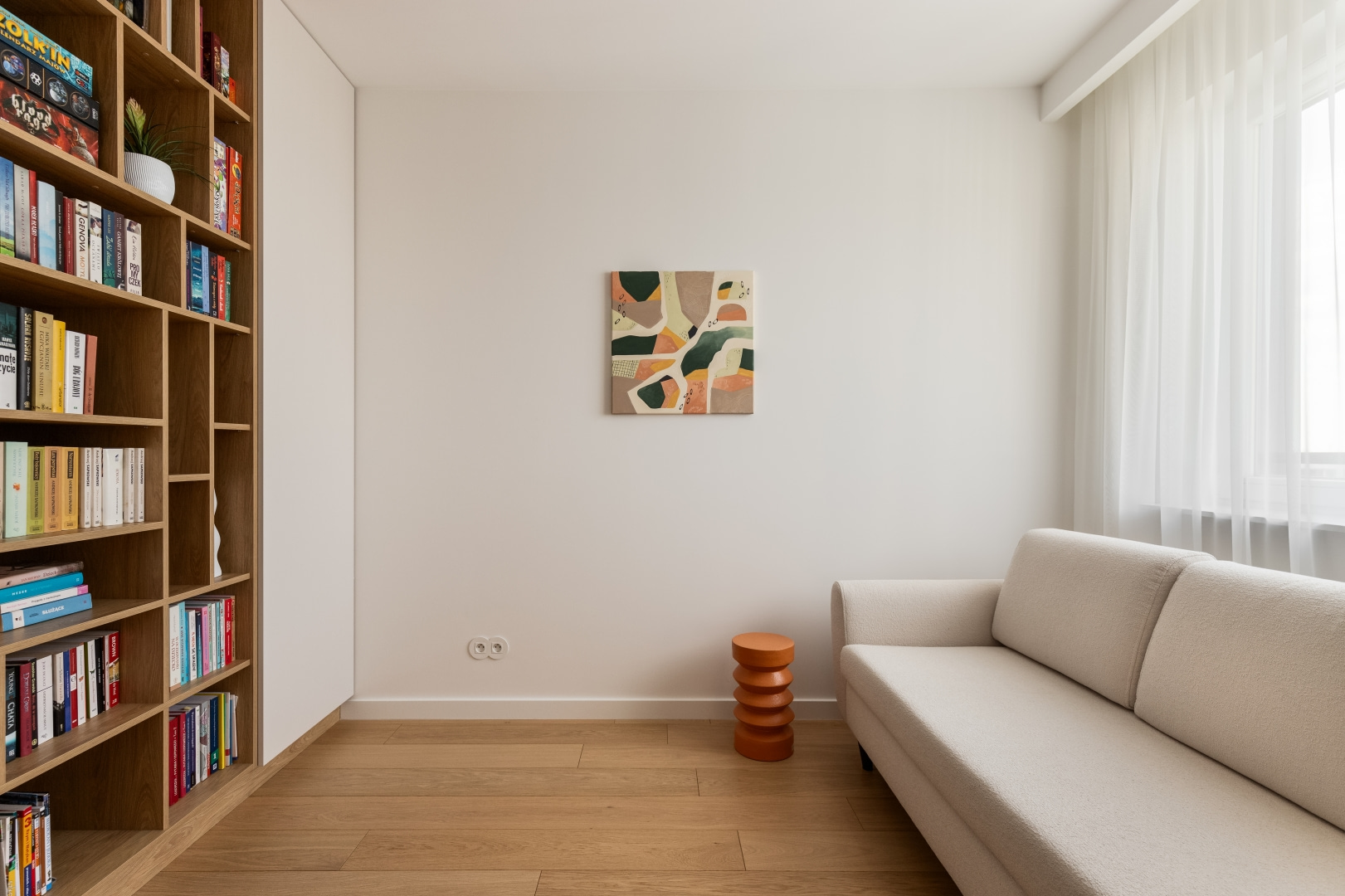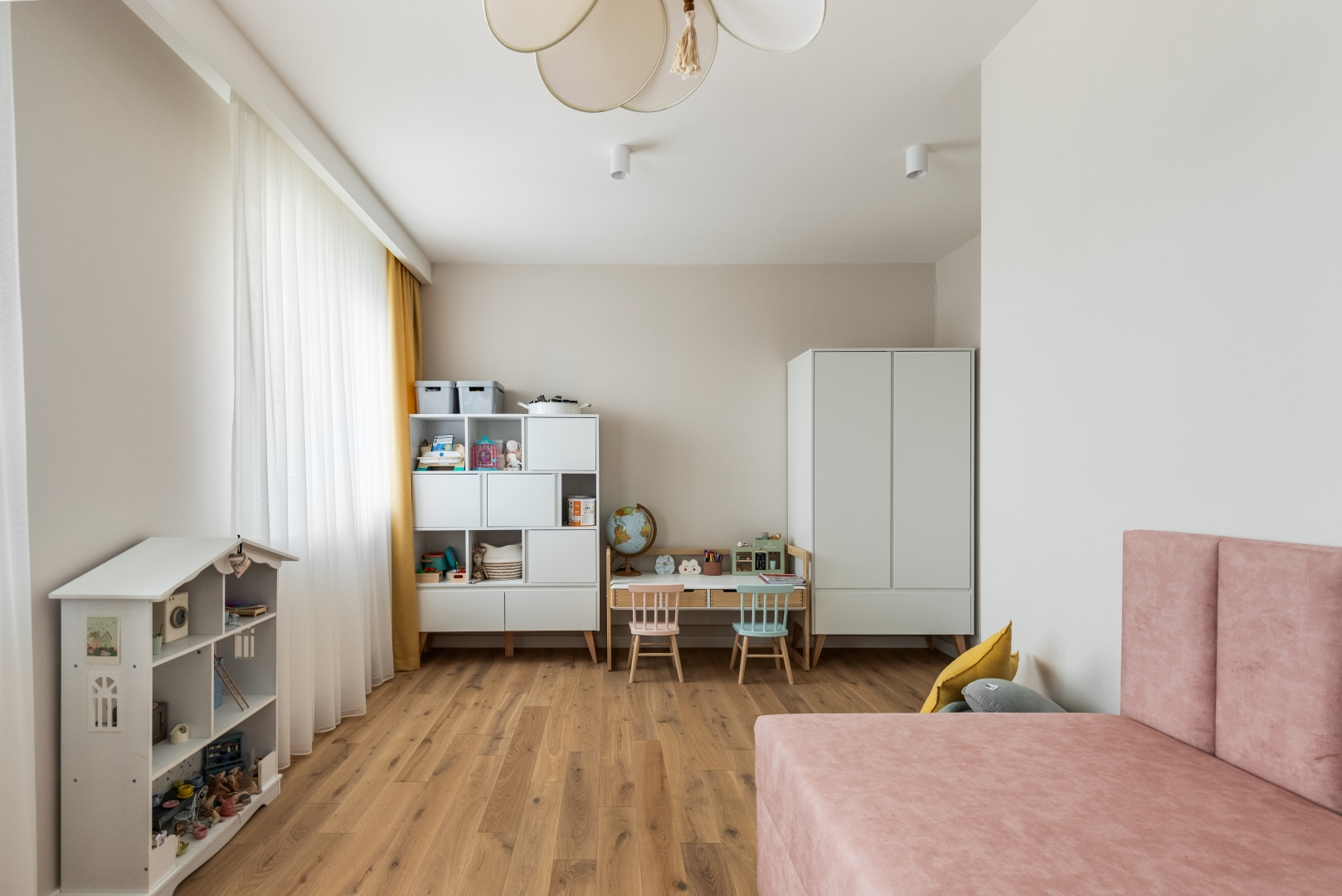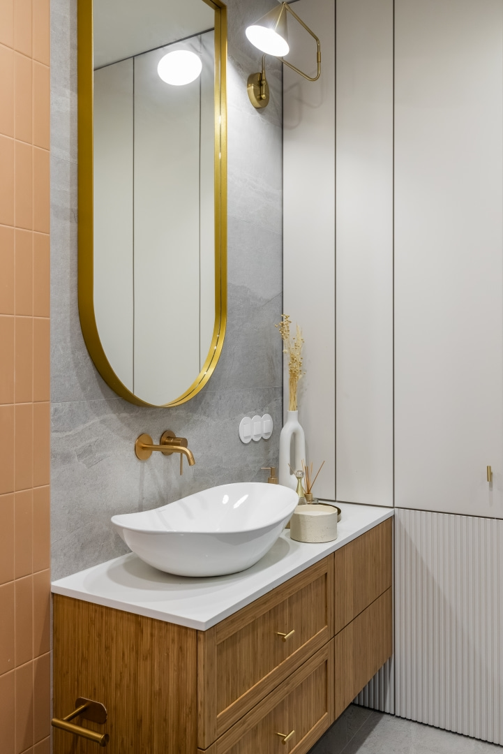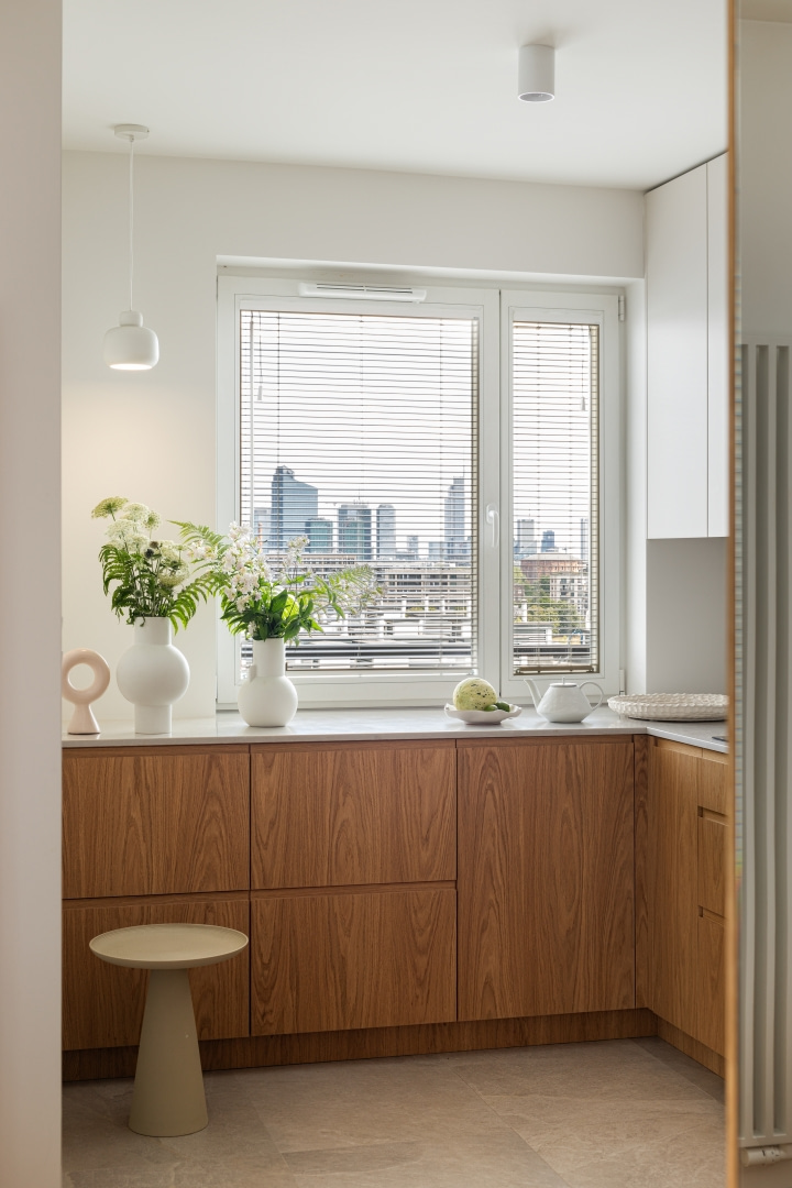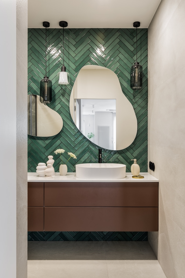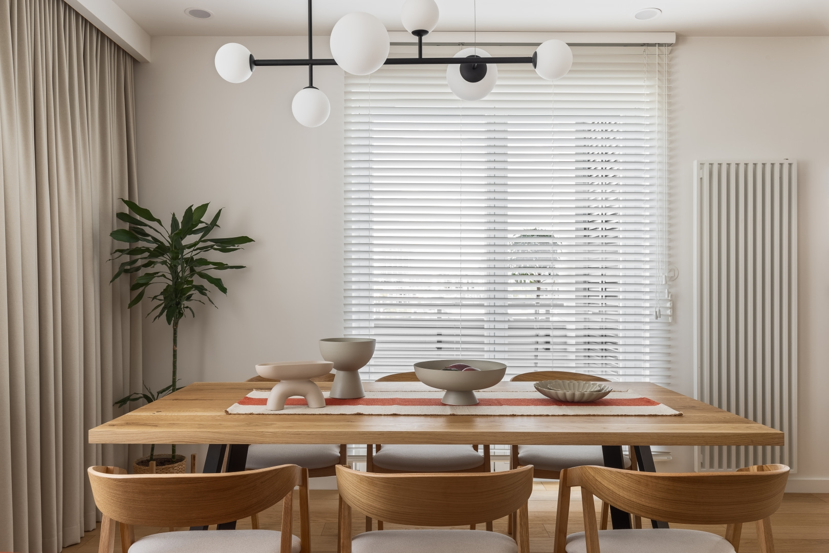 Wnętrza zaprojektowanego dla rodziny 2+1, dwupoziomowego mieszkania to harmonijne połączenie wyrazistości, przytulności i nowoczesności. Zestawienie spokojnej bazy japandi ze zdecydowanymi akcentami kolorystycznymi tworzy inspirujący, eklektyczny efekt. Czerwono-ruda kanapa w strefie dziennej staje się centralnym punktem, przyciągającym uwagę i nadającym wnętrzu wyrazu. Organiczne kształty stolików kawowych i luster dodają naturalności i lekkości, a ściana TV z forniru i tynku strukturalnego wraz z roślinnością prezentuje się jako nowoczesny, charakterystyczny element wystroju. Ideą projektu był uzyskanie kontrastu pomiędzy prostą i stonowaną strefą dzienną, a zamkniętymi pomieszczeniami, które miały wprowadzać energię oraz zaskakiwać swoimi kolorami.