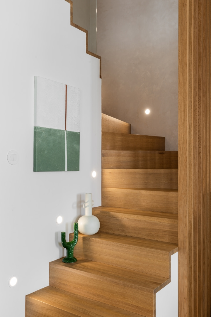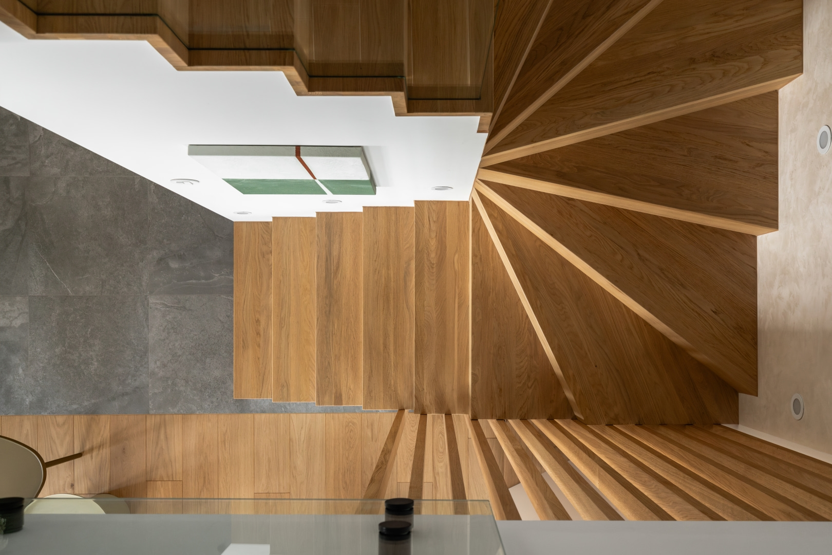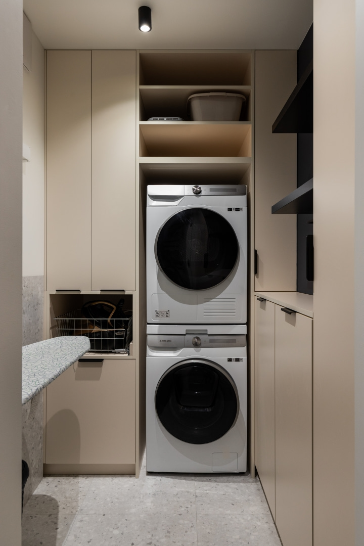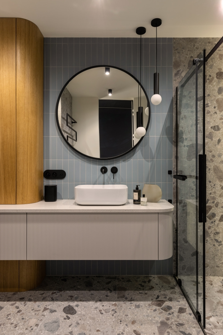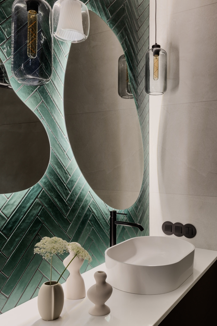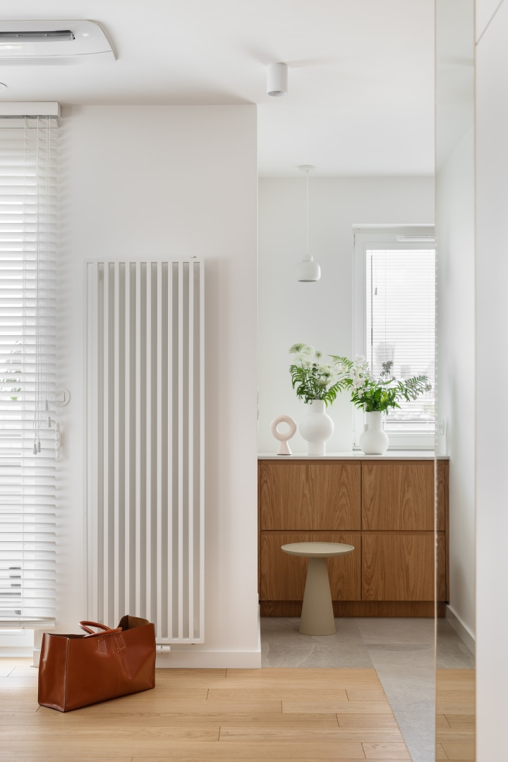 Wnętrza zaprojektowanego dla rodziny 2+1, dwupoziomowego mieszkania to harmonijne połączenie wyrazistości, przytulności i nowoczesności. Zestawienie spokojnej bazy japandi ze zdecydowanymi akcentami kolorystycznymi tworzy inspirujący, eklektyczny efekt. Czerwono-ruda kanapa w strefie dziennej staje się centralnym punktem, przyciągającym uwagę i nadającym wnętrzu wyrazu. Organiczne kształty stolików kawowych i luster dodają naturalności i lekkości, a ściana TV z forniru i tynku strukturalnego wraz z roślinnością prezentuje się jako nowoczesny, charakterystyczny element wystroju. Ideą projektu był uzyskanie kontrastu pomiędzy prostą i stonowaną strefą dzienną, a zamkniętymi pomieszczeniami, które miały wprowadzać energię oraz zaskakiwać swoimi kolorami.