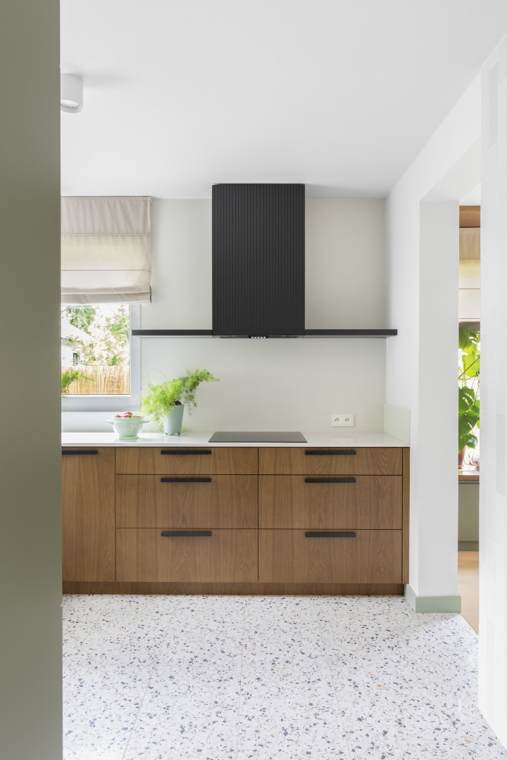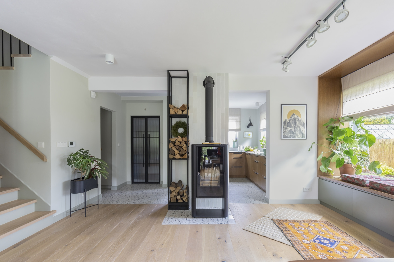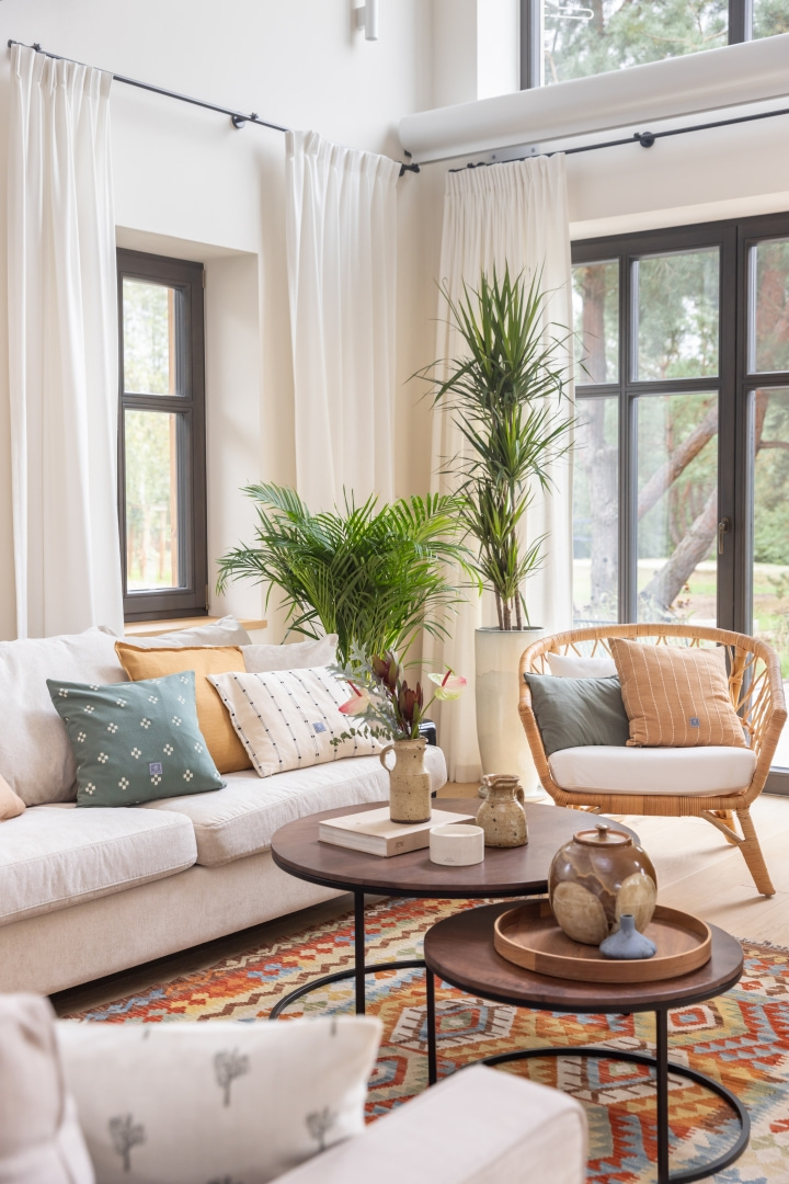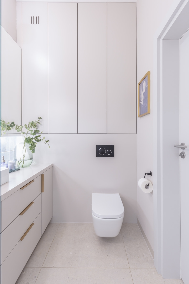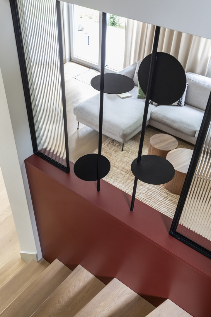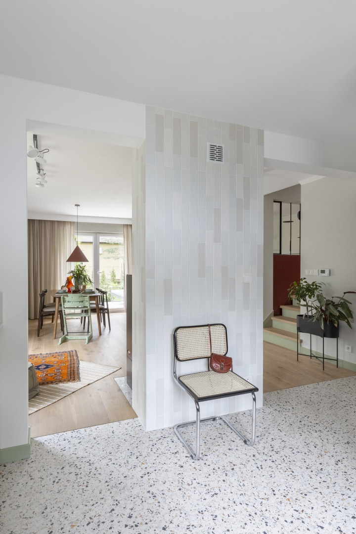 Dla młodej rodziny dom w Milanówku stał się ucieczką od miejskiego zgiełku i ramą dla nowego etapu życia. Wnętrza utrzymano w estetyce „pigmented minimal” – matowe powierzchnie, stonowane barwy i naturalne materiały wnoszą spokój, ale nie rezygnują z charakteru. Pojawiają się tu klasyki designu, m.in. krzesła Hałasa i Cesca Breuera, reprodukcje japońskich drzeworytów Ohary Kosona. W salonie wyróżnia się wykusz z siedziskiem na parapecie okna i pojemnymi szufladami na zabawki. Ażurowa balustrada, zabudowa ukrywająca telewizor, ergonomiczny gabinet, lustrzana szafa z pralką i suszarką czy meble rosnące z dzieckiem pokazują, jak funkcjonalność łączy się tu z estetyką. To wnętrze stworzone do codziennego życia, nie na pokaz – zrównoważone, osobiste, dopracowane w detalach.