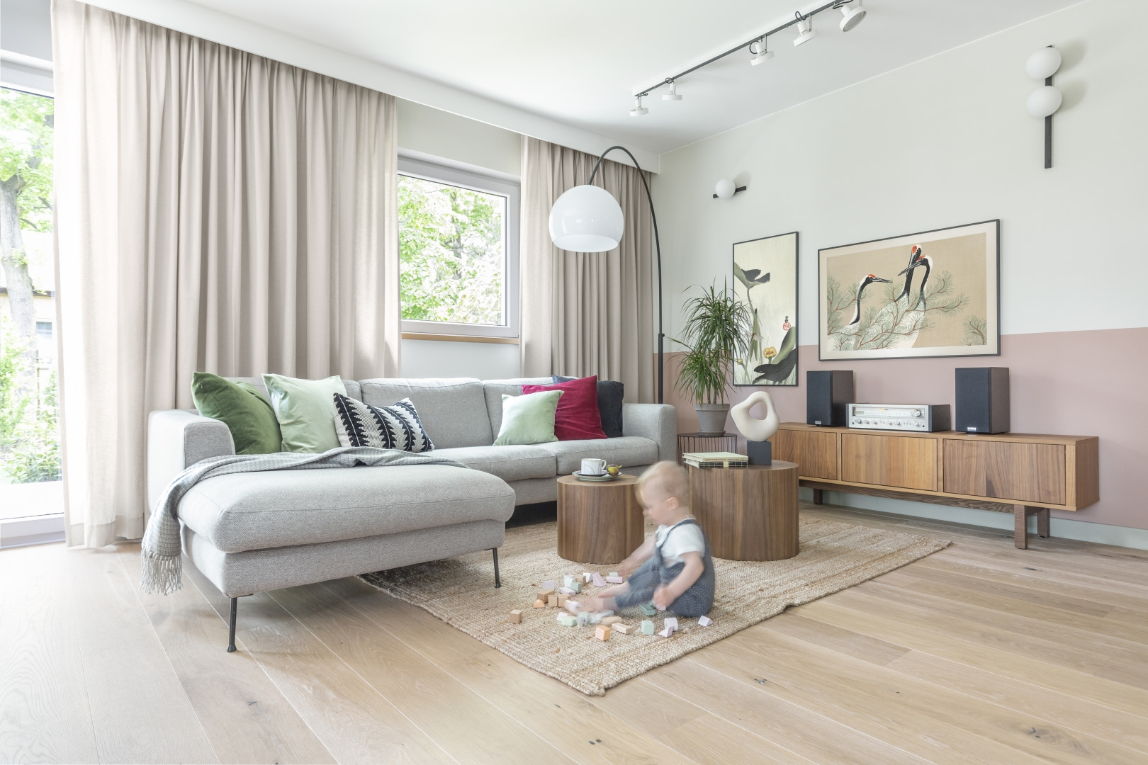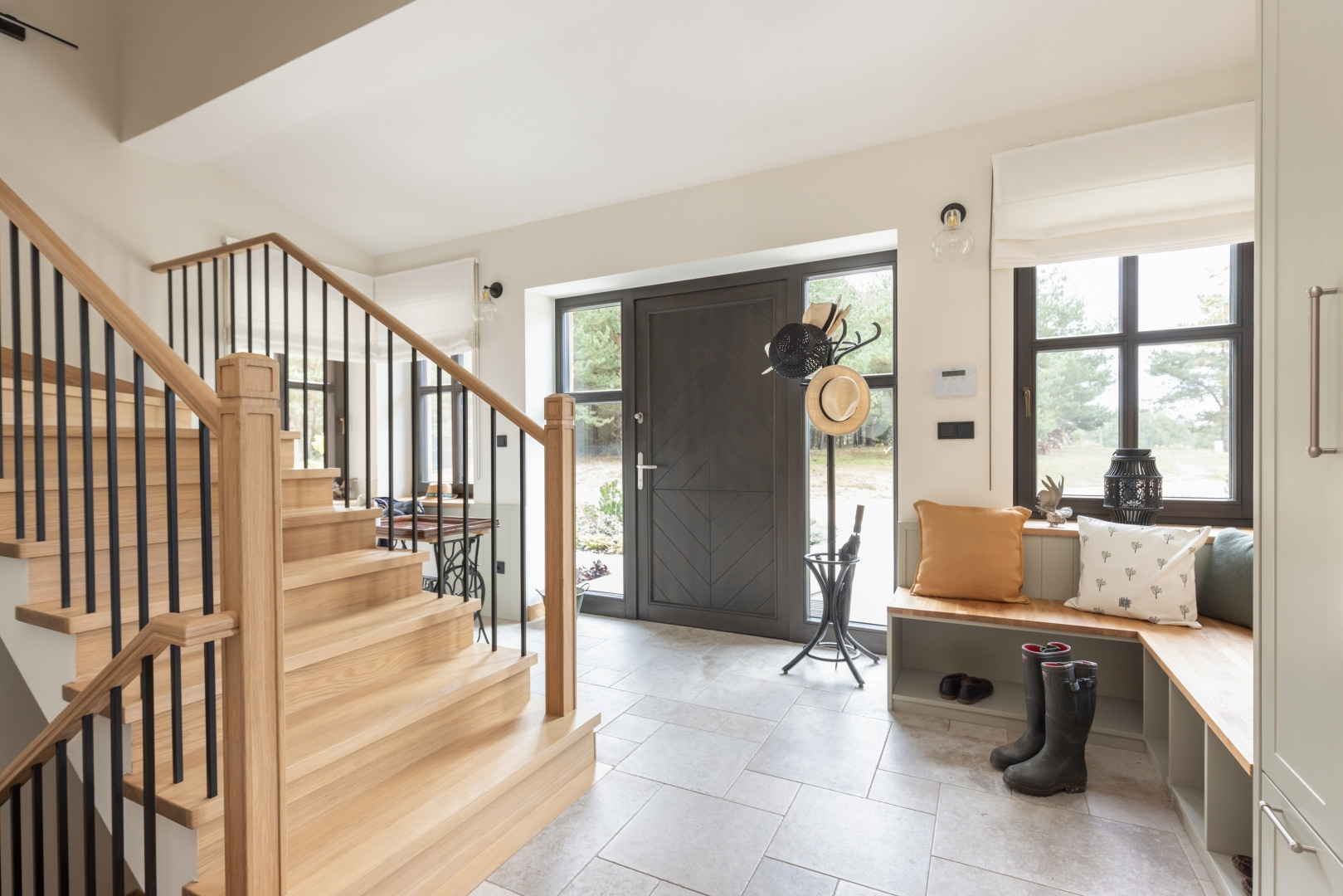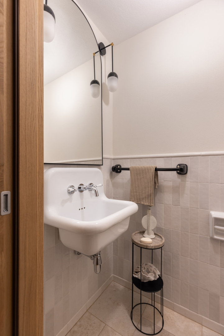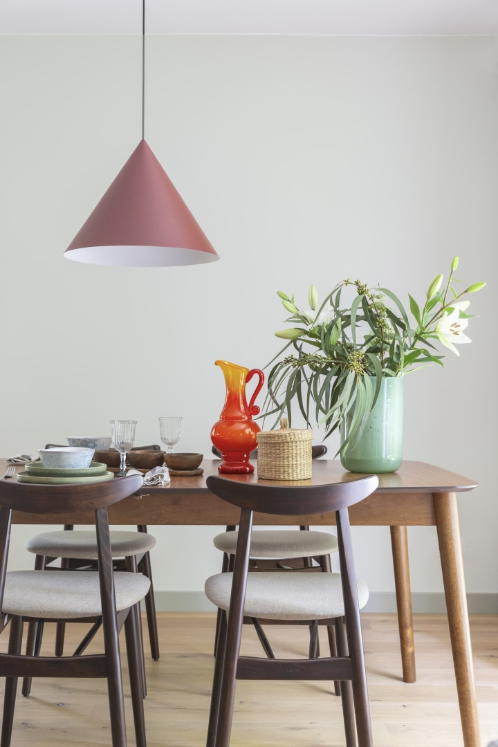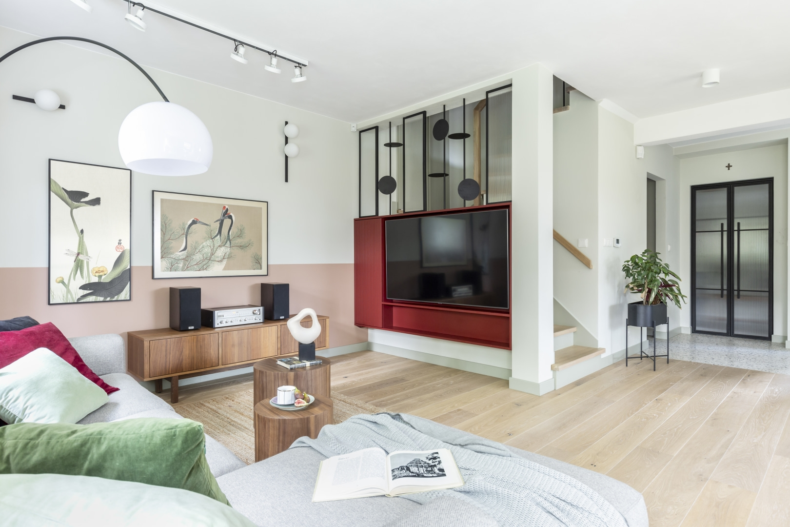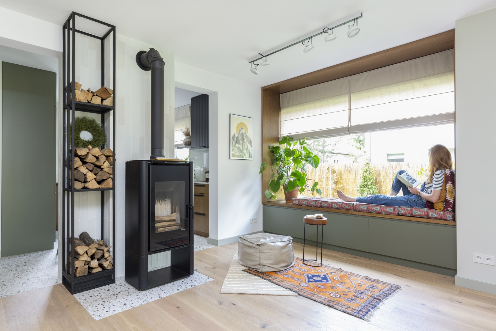 Dla młodej rodziny dom w Milanówku stał się ucieczką od miejskiego zgiełku i ramą dla nowego etapu życia. Wnętrza utrzymano w estetyce „pigmented minimal” – matowe powierzchnie, stonowane barwy i naturalne materiały wnoszą spokój, ale nie rezygnują z charakteru. Pojawiają się tu klasyki designu, m.in. krzesła Hałasa i Cesca Breuera, reprodukcje japońskich drzeworytów Ohary Kosona. W salonie wyróżnia się wykusz z siedziskiem na parapecie okna i pojemnymi szufladami na zabawki. Ażurowa balustrada, zabudowa ukrywająca telewizor, ergonomiczny gabinet, lustrzana szafa z pralką i suszarką czy meble rosnące z dzieckiem pokazują, jak funkcjonalność łączy się tu z estetyką. To wnętrze stworzone do codziennego życia, nie na pokaz – zrównoważone, osobiste, dopracowane w detalach.