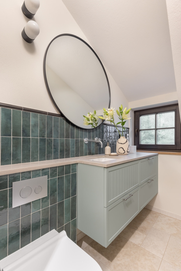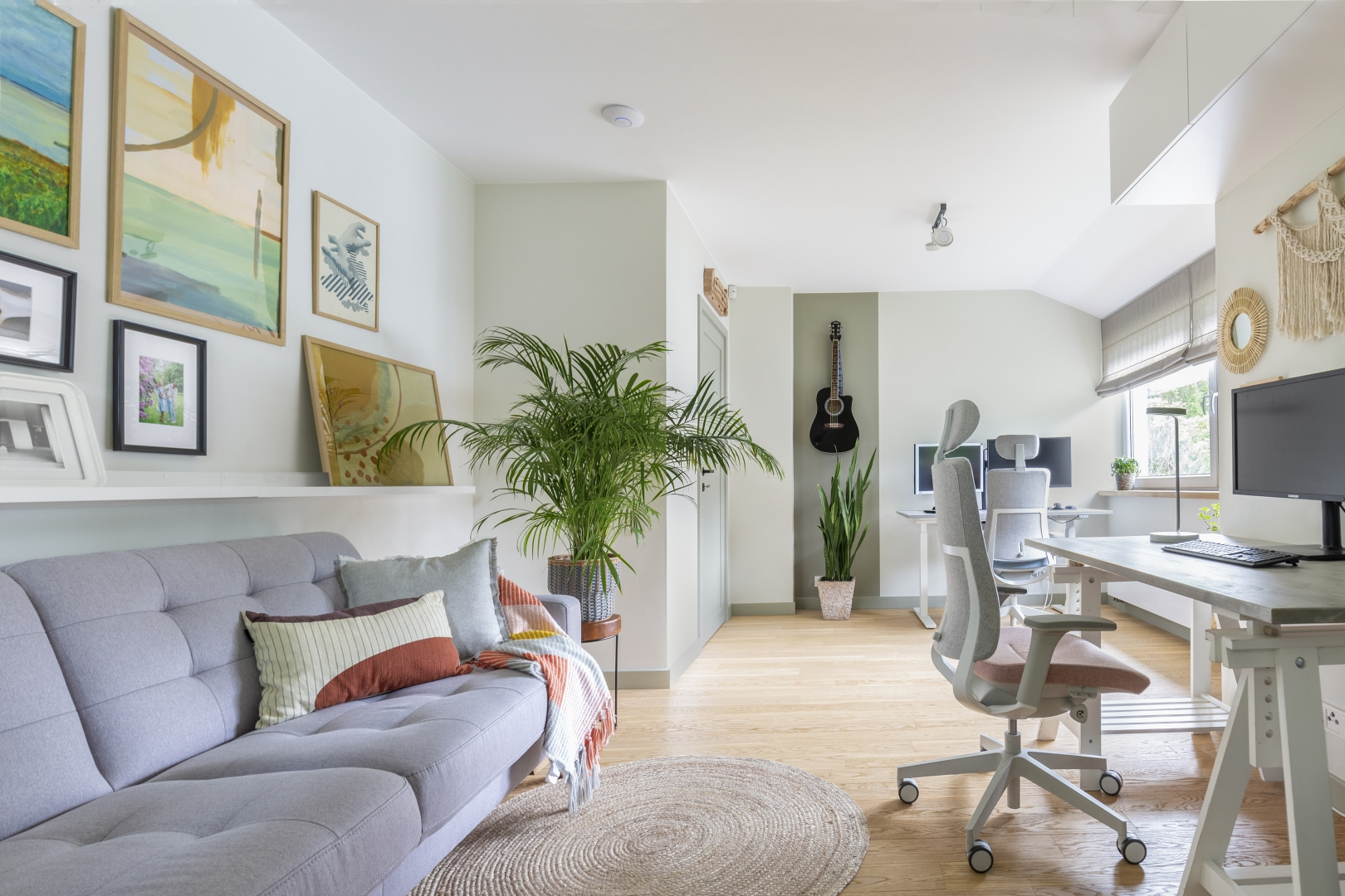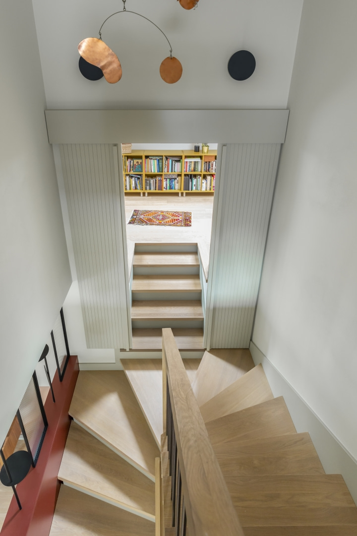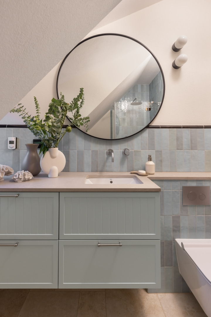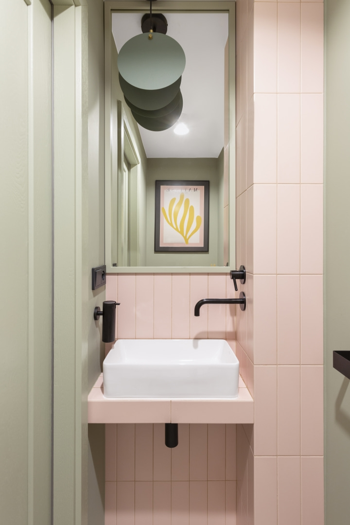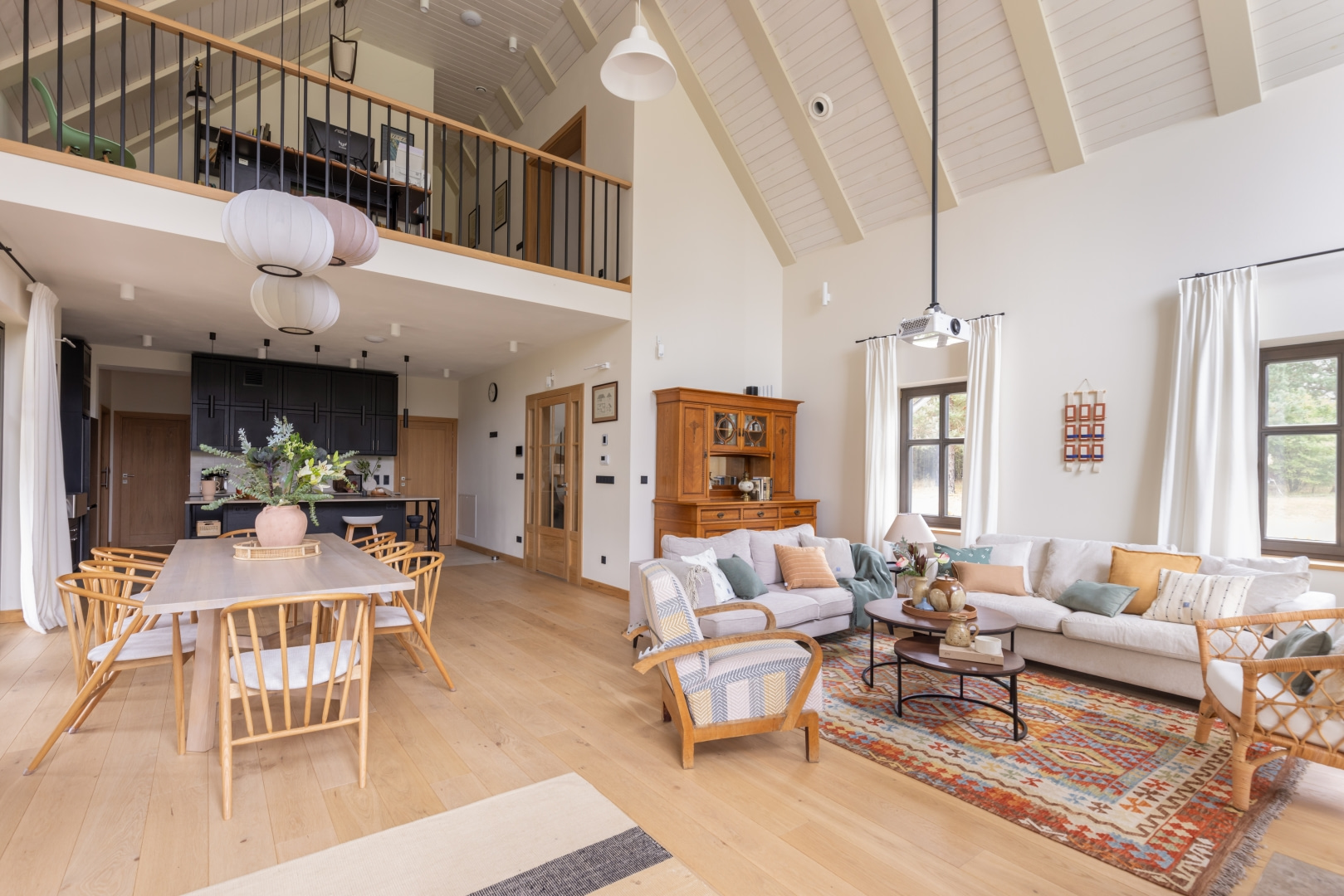 Dla młodej rodziny dom w Milanówku stał się ucieczką od miejskiego zgiełku i ramą dla nowego etapu życia. Wnętrza utrzymano w estetyce „pigmented minimal” – matowe powierzchnie, stonowane barwy i naturalne materiały wnoszą spokój, ale nie rezygnują z charakteru. Pojawiają się tu klasyki designu, m.in. krzesła Hałasa i Cesca Breuera, reprodukcje japońskich drzeworytów Ohary Kosona. W salonie wyróżnia się wykusz z siedziskiem na parapecie okna i pojemnymi szufladami na zabawki. Ażurowa balustrada, zabudowa ukrywająca telewizor, ergonomiczny gabinet, lustrzana szafa z pralką i suszarką czy meble rosnące z dzieckiem pokazują, jak funkcjonalność łączy się tu z estetyką. To wnętrze stworzone do codziennego życia, nie na pokaz – zrównoważone, osobiste, dopracowane w detalach.