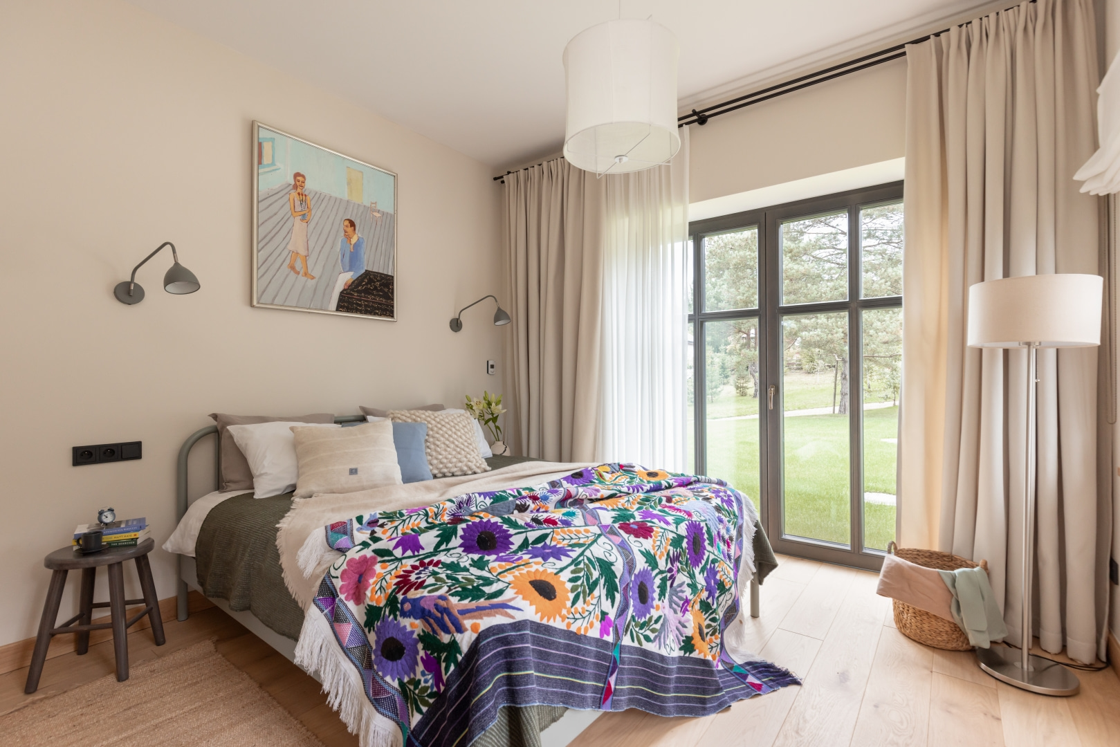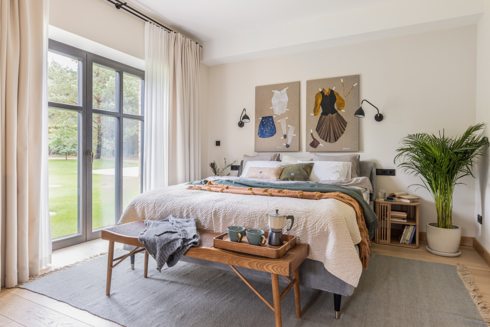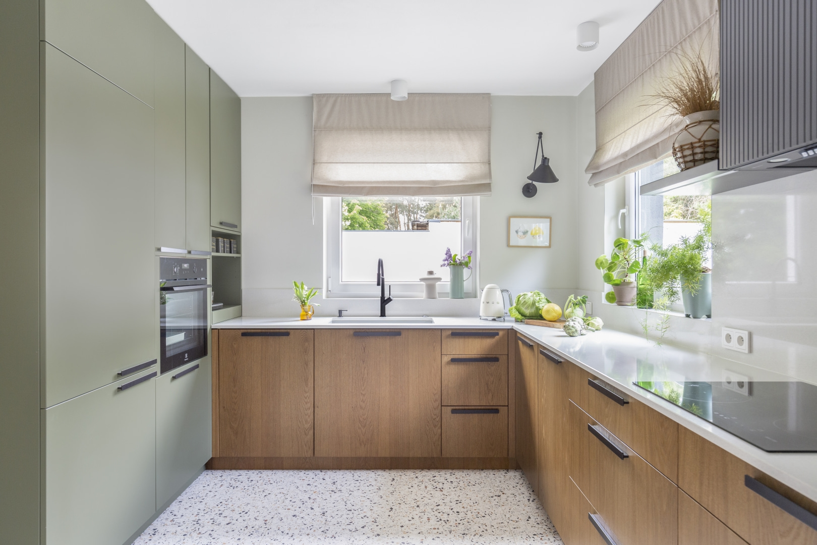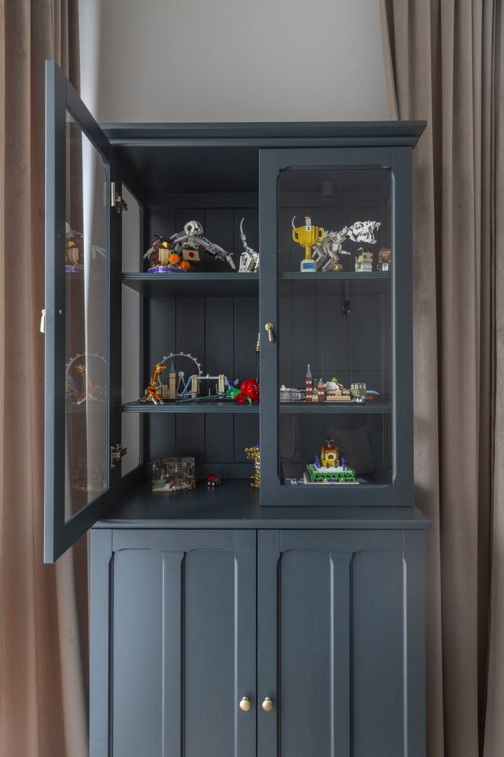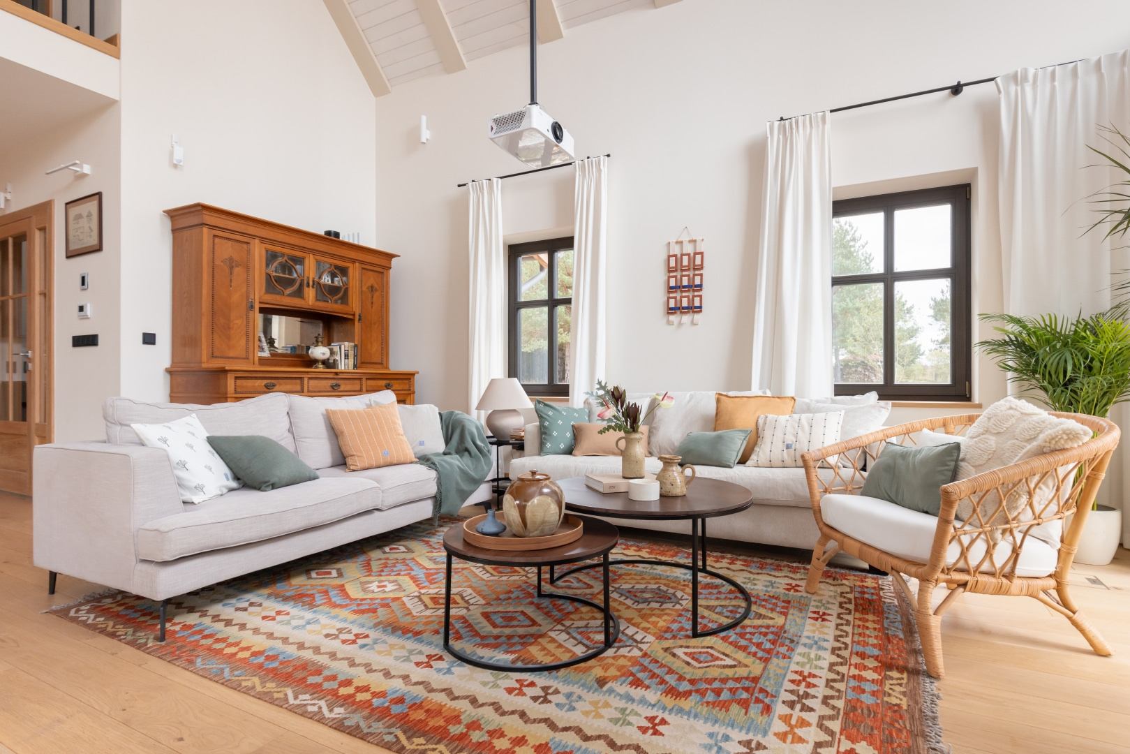 Dla młodej rodziny dom w Milanówku stał się ucieczką od miejskiego zgiełku i ramą dla nowego etapu życia. Wnętrza utrzymano w estetyce „pigmented minimal” – matowe powierzchnie, stonowane barwy i naturalne materiały wnoszą spokój, ale nie rezygnują z charakteru. Pojawiają się tu klasyki designu, m.in. krzesła Hałasa i Cesca Breuera, reprodukcje japońskich drzeworytów Ohary Kosona. W salonie wyróżnia się wykusz z siedziskiem na parapecie okna i pojemnymi szufladami na zabawki. Ażurowa balustrada, zabudowa ukrywająca telewizor, ergonomiczny gabinet, lustrzana szafa z pralką i suszarką czy meble rosnące z dzieckiem pokazują, jak funkcjonalność łączy się tu z estetyką. To wnętrze stworzone do codziennego życia, nie na pokaz – zrównoważone, osobiste, dopracowane w detalach.