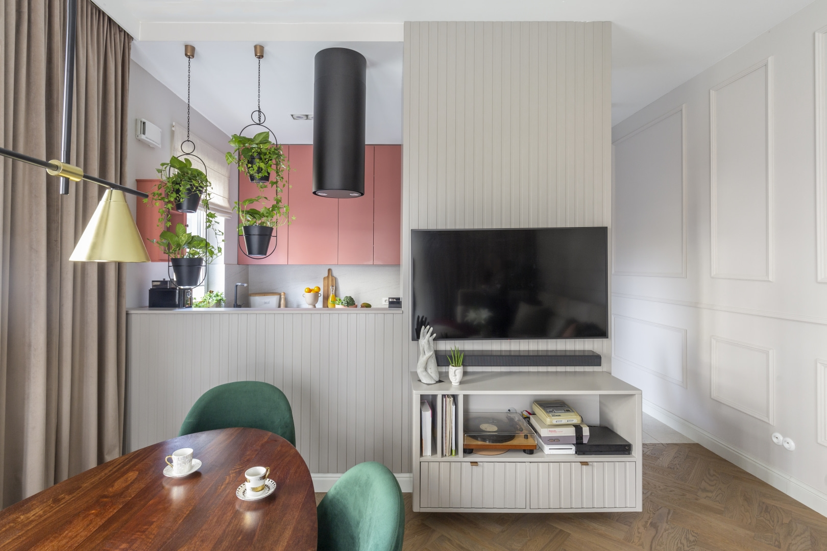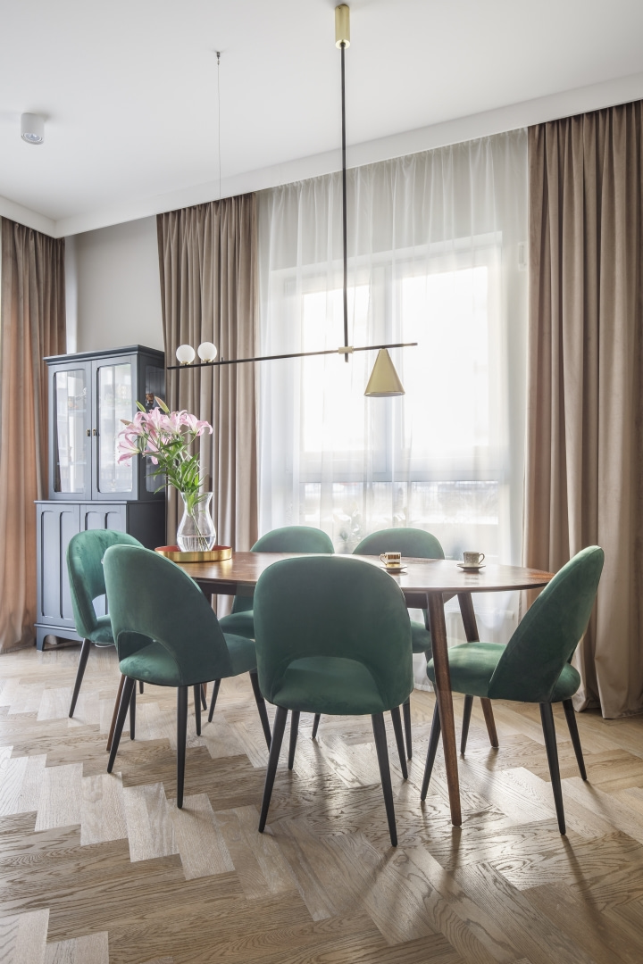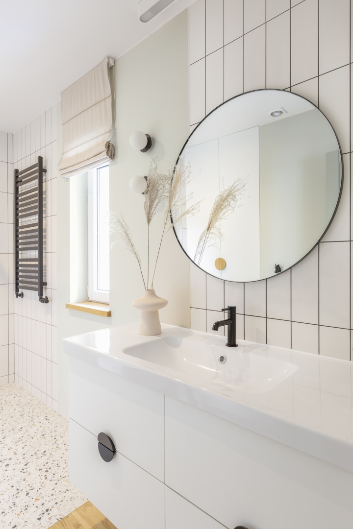 Mieszkanie na parterze z dużym ogrodem to idealne tło dla codzienności młodej rodziny. Nowoczesność przeplata się tu z klimatem vintage i nutą stylu hampton, a ponad trzy metry wysokości wnętrz pozwala na jasną, elegancką aranżację z rytmiczną sztukaterią i miękką paletą barw. Przestrzeń jest klarownie uporządkowana: poszczególne strefy wyznaczono za pomocą światła, materiałów i kolorów, a każdy centymetr wykorzystano praktycznie. Jest miejsce na wspólne posiłki, szybkie śniadania, pracę zdalną i odpoczynek – zarówno na sofie, jak i na tarasie otoczonym zielenią. Zabudowa w holu kryje pralkę i suszarkę. Zamiast mebli z epoki, które były inspiracją, właściciele wybrali nowe, personalizowane rozwiązania – bardziej funkcjonalne i ergonomiczne, ale w duchu vintage.