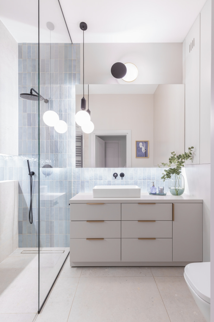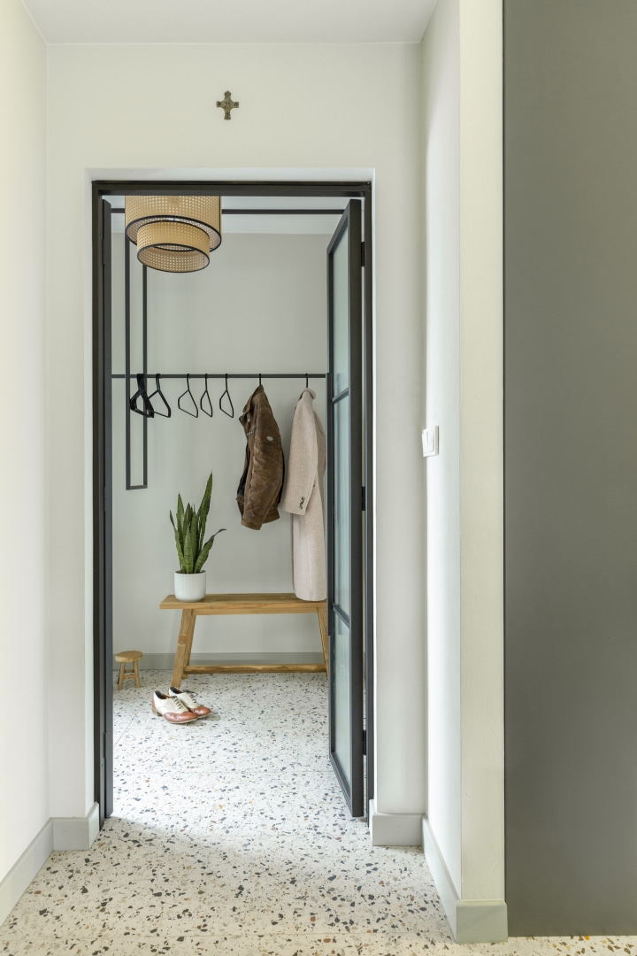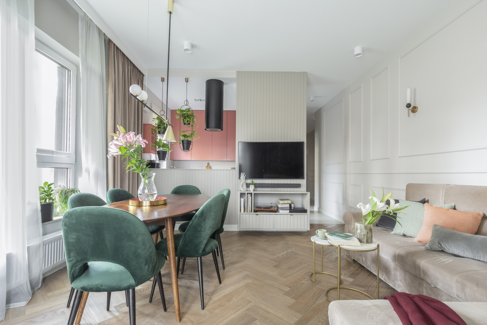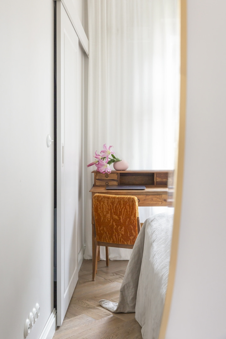 Mieszkanie na parterze z dużym ogrodem to idealne tło dla codzienności młodej rodziny. Nowoczesność przeplata się tu z klimatem vintage i nutą stylu hampton, a ponad trzy metry wysokości wnętrz pozwala na jasną, elegancką aranżację z rytmiczną sztukaterią i miękką paletą barw. Przestrzeń jest klarownie uporządkowana: poszczególne strefy wyznaczono za pomocą światła, materiałów i kolorów, a każdy centymetr wykorzystano praktycznie. Jest miejsce na wspólne posiłki, szybkie śniadania, pracę zdalną i odpoczynek – zarówno na sofie, jak i na tarasie otoczonym zielenią. Zabudowa w holu kryje pralkę i suszarkę. Zamiast mebli z epoki, które były inspiracją, właściciele wybrali nowe, personalizowane rozwiązania – bardziej funkcjonalne i ergonomiczne, ale w duchu vintage.