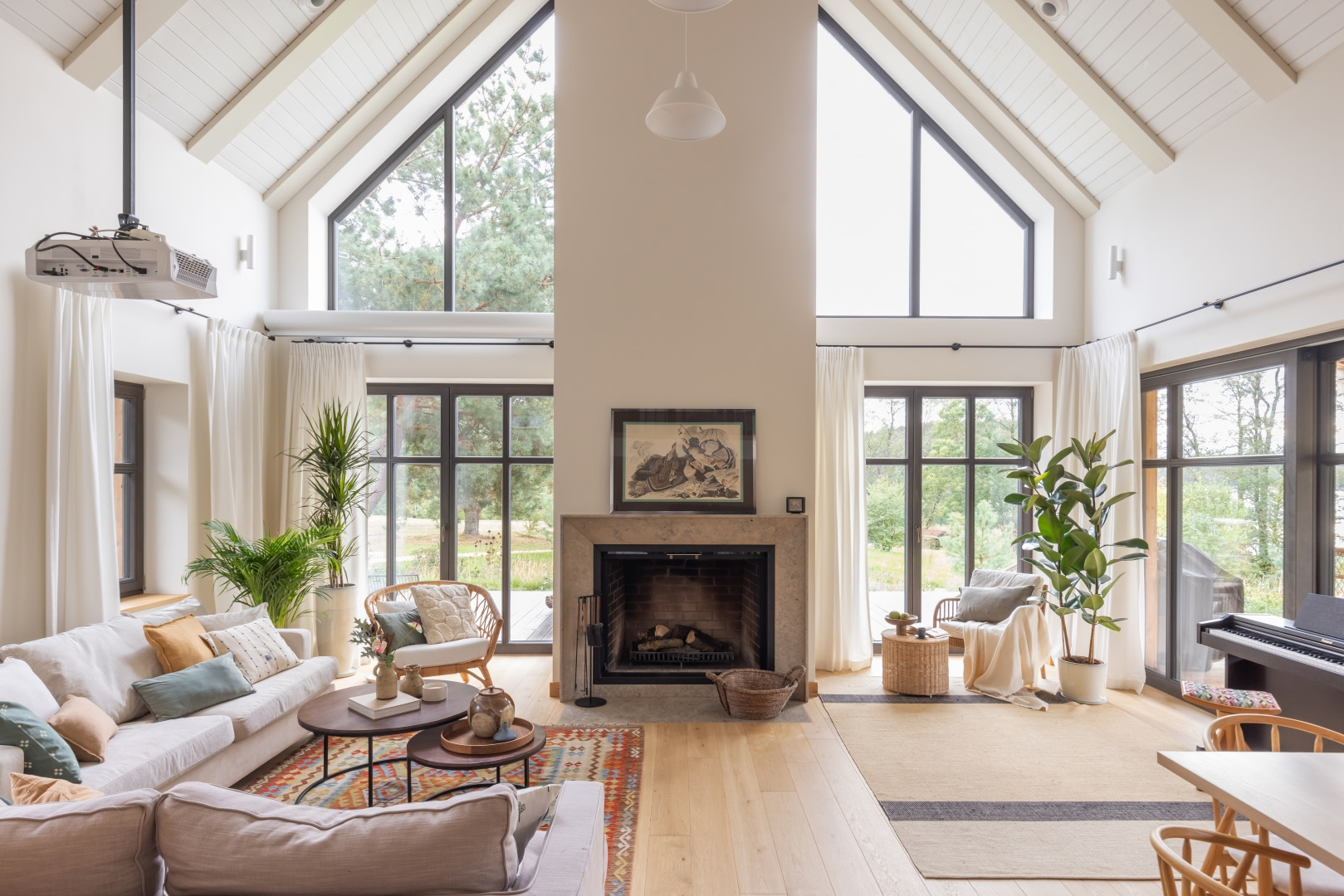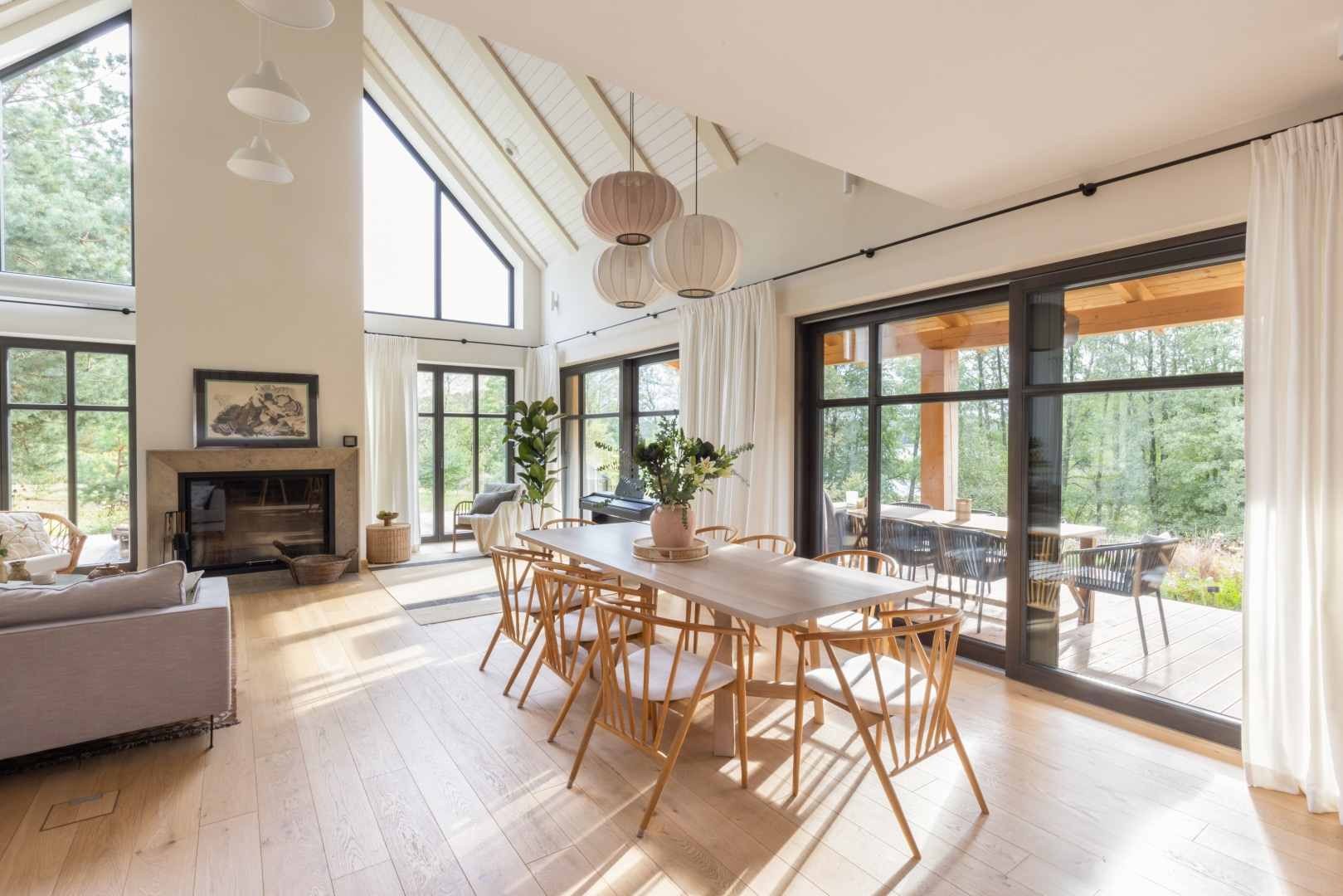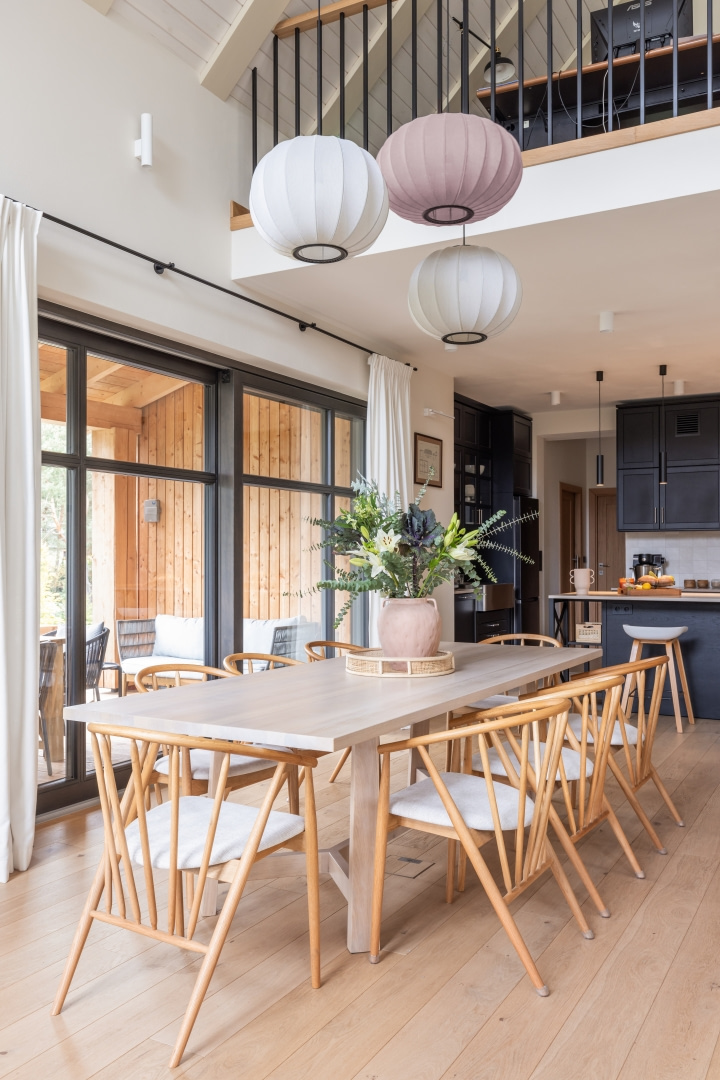 Ten wakacyjny dom zaprojektowano z myślą o rodzinnych spotkaniach, odpoczynku z psami i aktywnościach na łonie natury. Wnętrza miały być spokojne, eleganckie i nawiązywać do lokalnego krajobrazu. Postawiono na stonowaną paletę zgaszonej zieleni, błękitów i szarobeży oraz dużo drewna – w meblach, stolarce i na suficie. Każda sypialnia zyskała własną łazienkę i garderobę, kuchnia – podręczną spiżarnię. Centralnym punktem domu jest kominek wykonany przez zduna. We wnętrzu znalazły się też meble inwestorów, m.in. odnowiony kredens zestawiony z nowymi sofami i dodatkami. Duże przeszklenia otwierają dom na jezioro i las, a naturalne światło podkreśla atmosferę spokoju. Tempo realizacji było imponujące – od braku więźby w marcu do rodzinnego lepienia pierogów w nowej kuchni w grudniu.