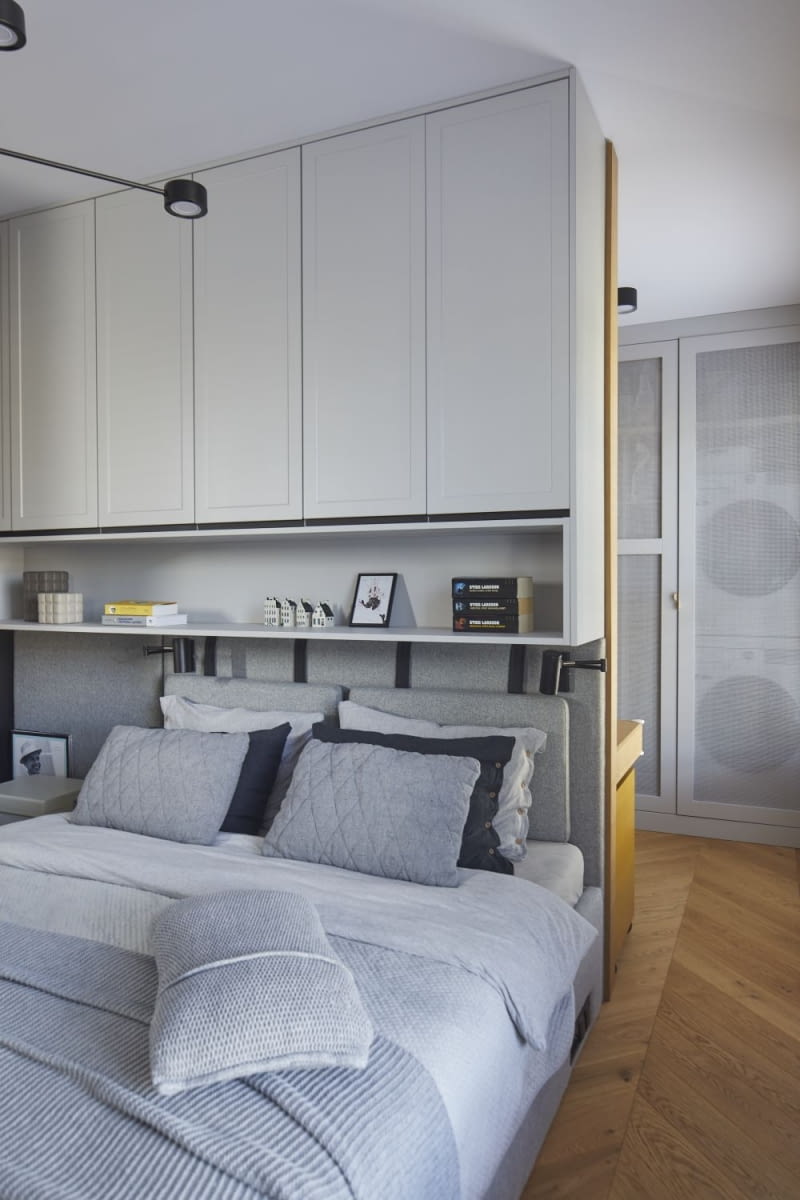 W sypialni rodziców o uwagę konkurują dwie ściany. Pierwszą, z łóżkiem, tapicerowanym zagłówkiem i zamontowaną nad nią zabudową wyróżnia paleta barw dobrana w szarościach. Drugą, naprzeciwko wykończono z użyciem dębowych lameli i luster umieszczonych przy oknie. Tafle powiększają optycznie nieduży pokój.