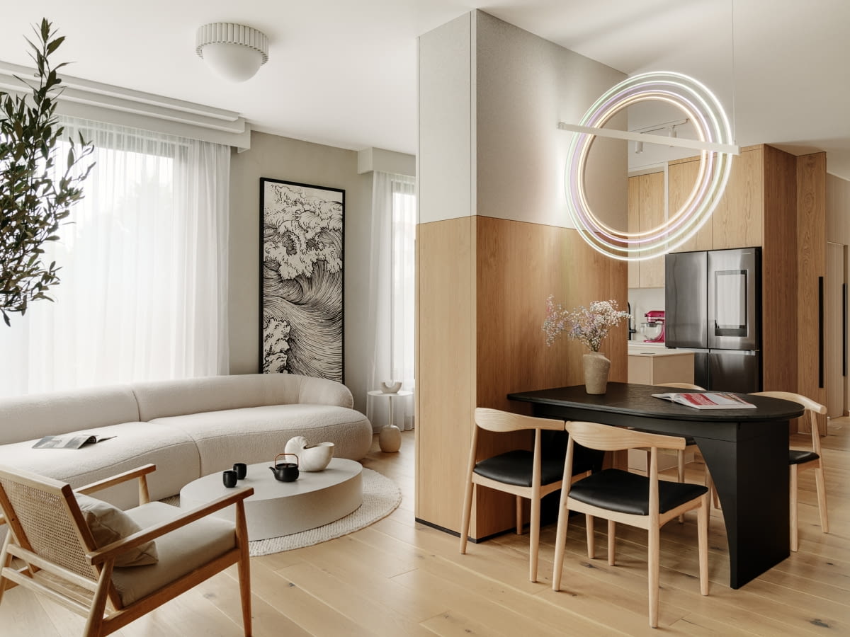 Wspólnym punktem odniesienia stała się estetyka japandi – stylistyka łącząca japońską prostotę z nordyckim pragmatyzmem i funkcjonalnością. To nie tylko trend, ale wręcz filozofia – zrównoważone życie, czerpanie z natury i świadome korzystanie z piękna rzeczy prostych. Architekt miał już doświadczenie w tworzeniu podobnych wnętrz. Wcześniej realizował projekt dla rodowitej Japonki, co pozwoliło mu lepiej zrozumieć autentyczność tej estetyki i przenieść ją na polski grunt.