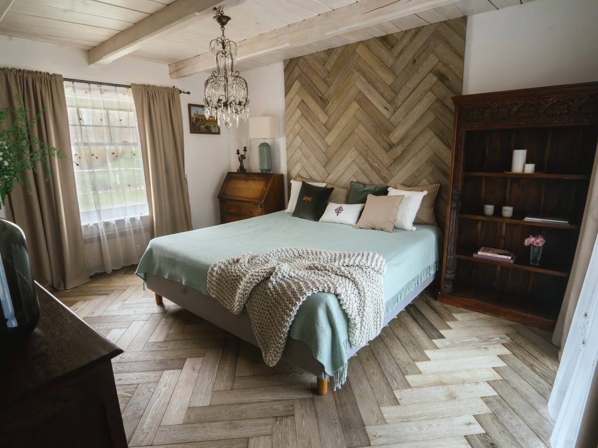 Dekor Dark Omen (na zdjęciu w układzie jodełki klasycznej) wyróżnia się oryginalną, chłodną barwą. Powierzchnia desek mieni się kolorami palonego drewna - od bursztynu po ciemny brąz. Linia Brushed Line dostępna jest teraz wyłącznie w wykończeniu Fusion Hybrid. To jedyna taka na rynku, autorska metoda zabezpieczania podłóg drewnianych już na etapie produkcji, która zapewnia trwałość i estetyczny wygląd na lata.