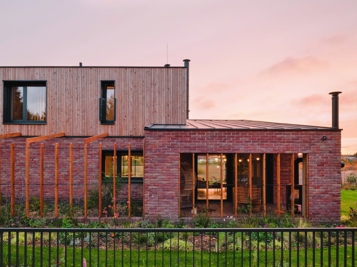 Dom ma dwa tarasy – jeden otwarty, zlokalizowany od strony wschodniej, drugi – w formie intymniejszego ogrodu zimowego od zachodu. Budynek koresponduje materiałami wykończeniowymi z otoczeniem lasu i jeziora – poprzez połączenie elewacji ceglanej w części parterowej wraz z drewnianą elewacją na piętrze. Forma domu jest odpowiedzią na kontekst, dom zwraca się całkowicie w kierunku jeziora podporządkowując się otoczeniu oraz umożliwiając przyszłym mieszkańcom korzystanie w pełni z otoczenia. Dom od początkowej fazy projektowany był ze świadomością budżetu. Takie podejście umożliwiło nam połączenie sił z inwestorami w celu negocjowania cen od dostawców i kontrolowania wyników. Pomogło to uniknąć tzw. ustępstw i niemal całkowicie zrealizować nasze założenia.