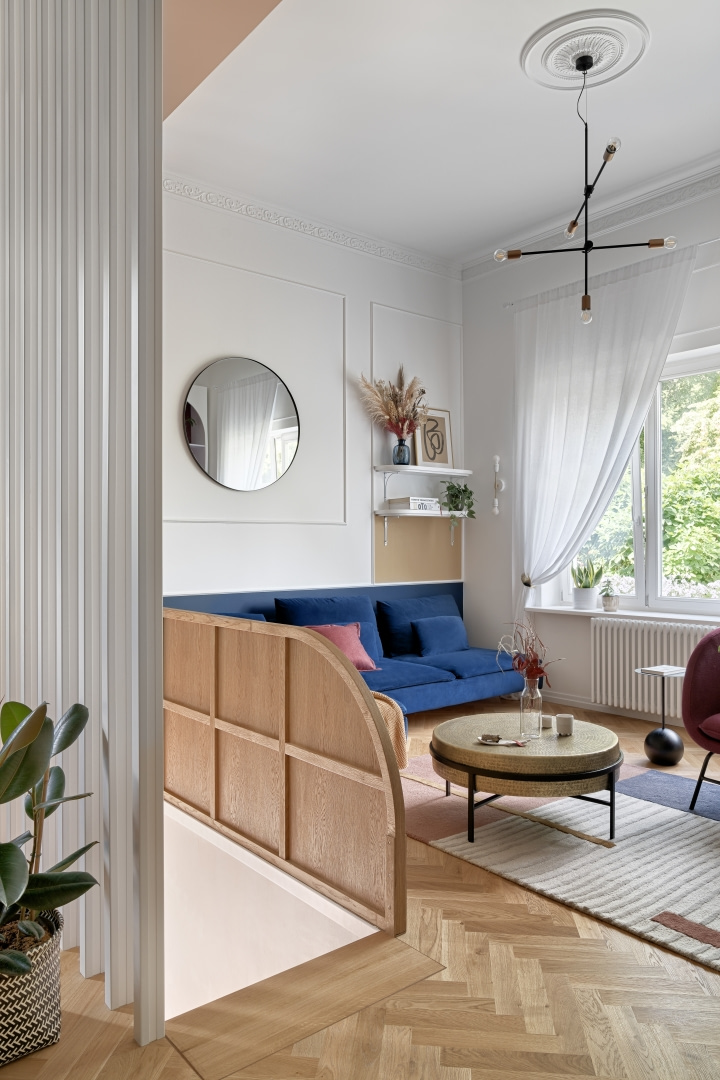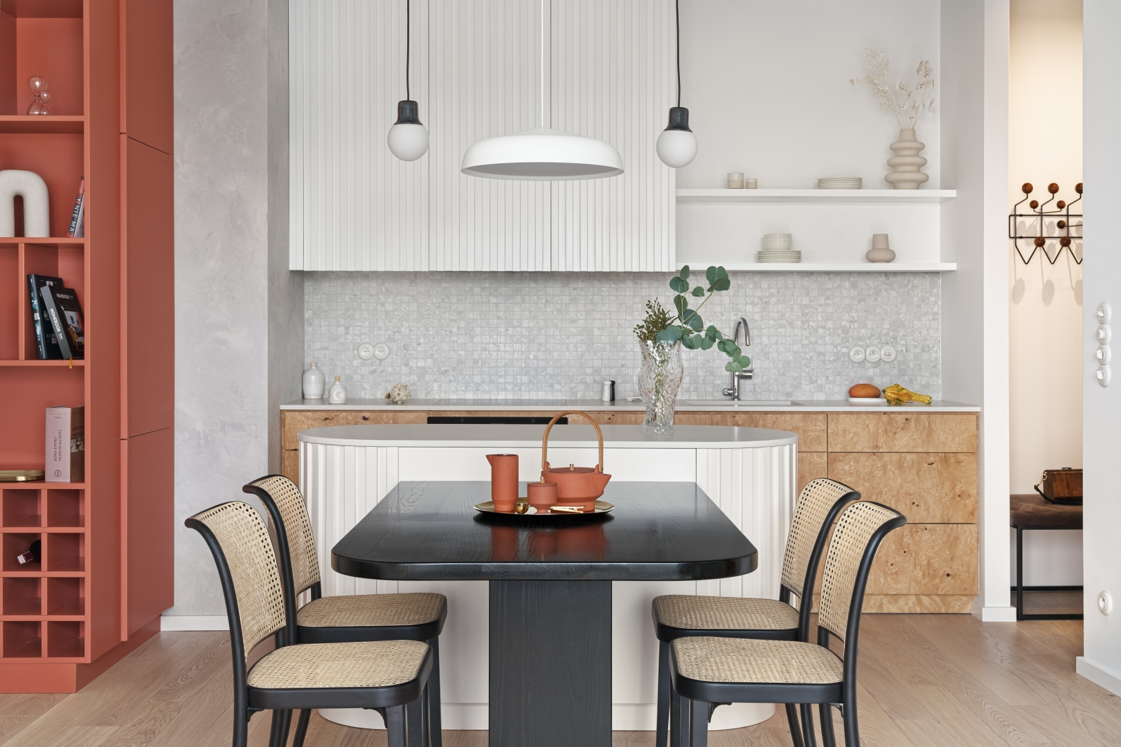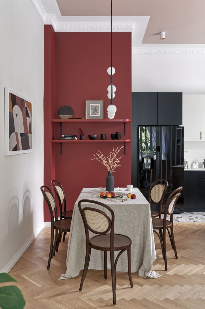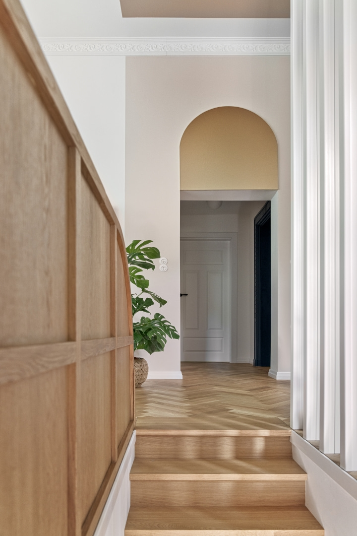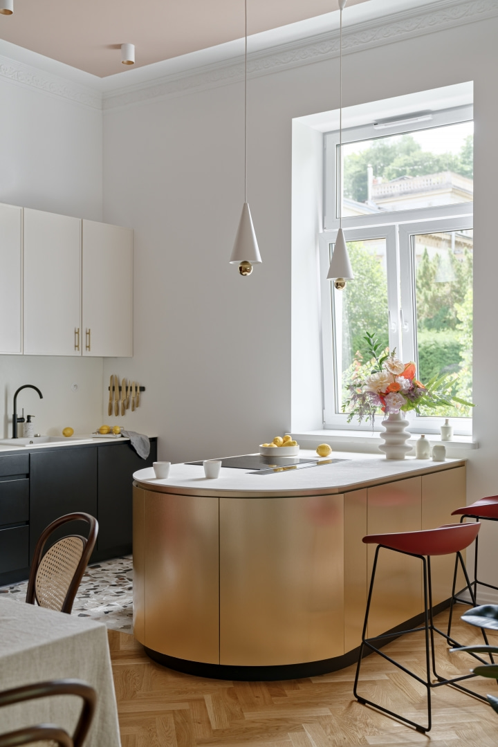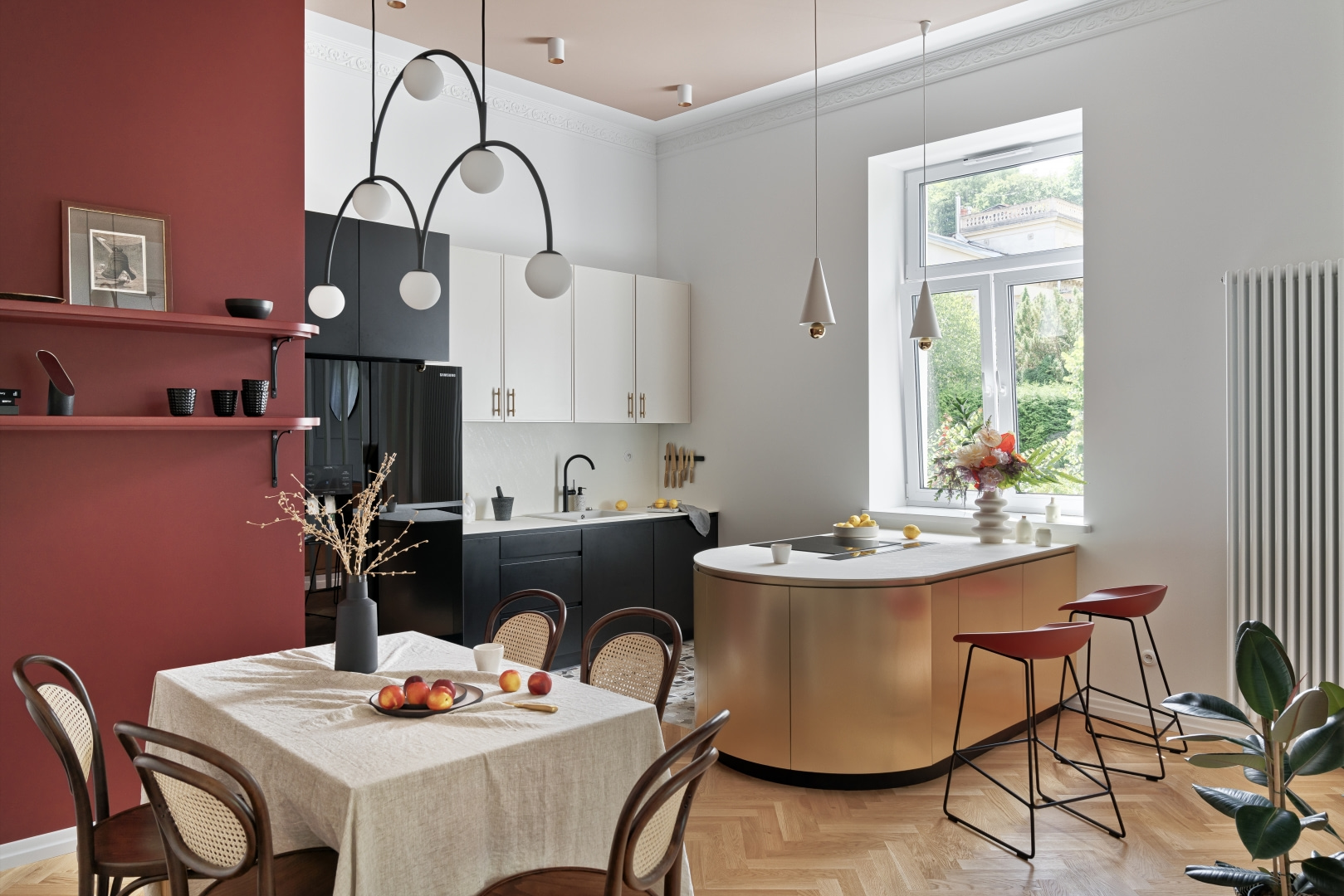 W gdańskiej, niemal 100-letniej kamienicy po całkowitej metamorfozie powstało odważne, pełne koloru mieszkanie, w którym nowoczesność współgra z historycznymi detalami. Przeniesiona na piętro kuchnia ze złotą wyspą stała się najważniejszym miejscem domu, a jadalnia w ciemnej czerwieni dodaje wnętrzu energii i charakteru. W salonie dominują łuki, koła, liczne akcenty kolorystyczne w ciepłej palecie barw, równoważącej biel ścian. Piętro uzupełniają pokój gościnny i łazienka z czerwienią i lastryko, konsekwentnie nawiązujące do strefy dziennej. Sypialnię przeniesiono na dół, tworząc przestrzeń z prywatną łazienką. Całość spajają geometryczne podziały, wspólne barwy i autorskie rozwiązania, dzięki którym mieszkanie zyskuje wyjątkowy klimat.