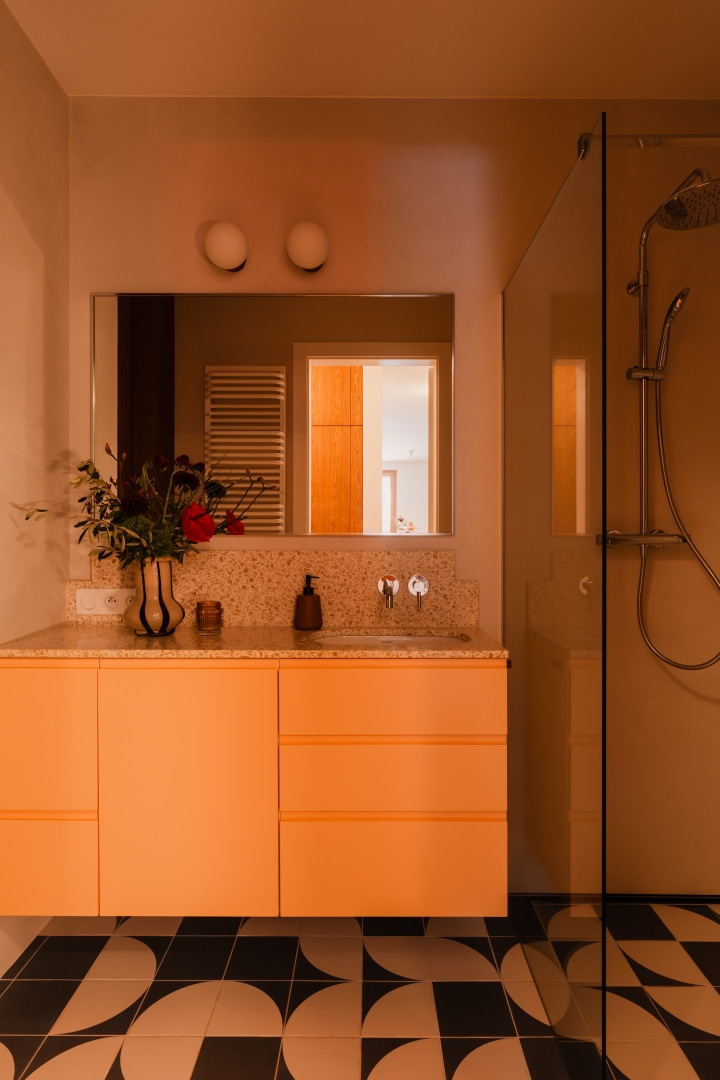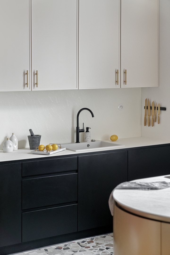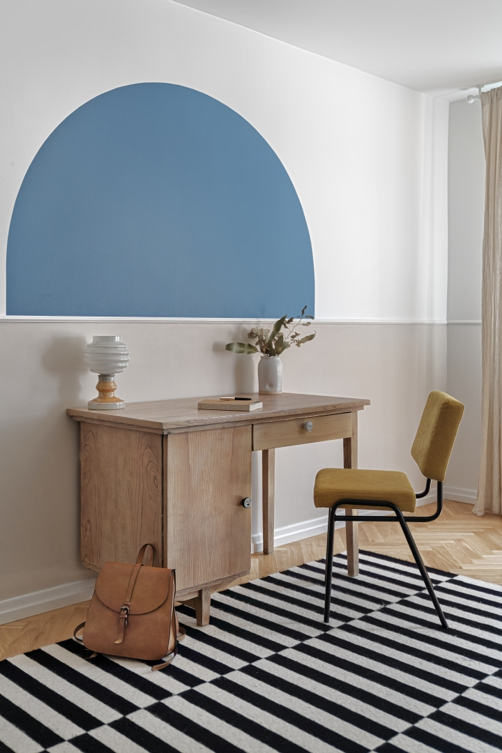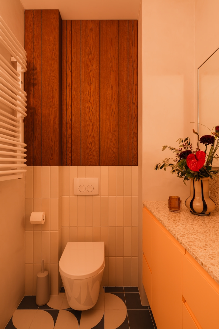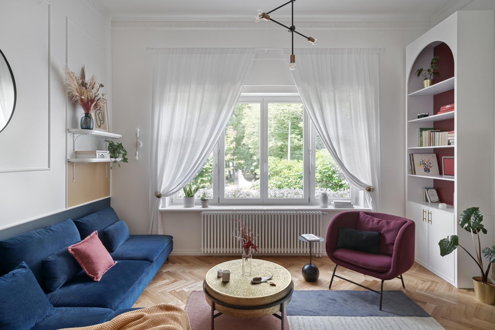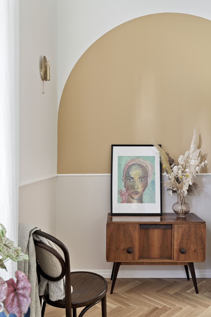 W gdańskiej, niemal 100-letniej kamienicy po całkowitej metamorfozie powstało odważne, pełne koloru mieszkanie, w którym nowoczesność współgra z historycznymi detalami. Przeniesiona na piętro kuchnia ze złotą wyspą stała się najważniejszym miejscem domu, a jadalnia w ciemnej czerwieni dodaje wnętrzu energii i charakteru. W salonie dominują łuki, koła, liczne akcenty kolorystyczne w ciepłej palecie barw, równoważącej biel ścian. Piętro uzupełniają pokój gościnny i łazienka z czerwienią i lastryko, konsekwentnie nawiązujące do strefy dziennej. Sypialnię przeniesiono na dół, tworząc przestrzeń z prywatną łazienką. Całość spajają geometryczne podziały, wspólne barwy i autorskie rozwiązania, dzięki którym mieszkanie zyskuje wyjątkowy klimat.