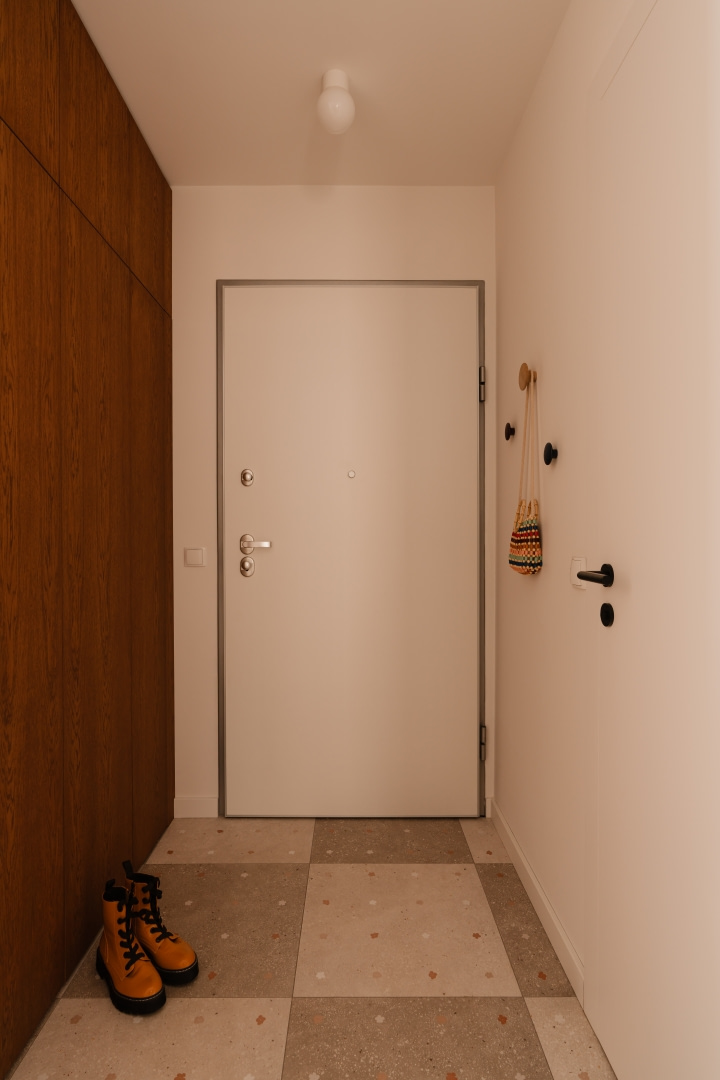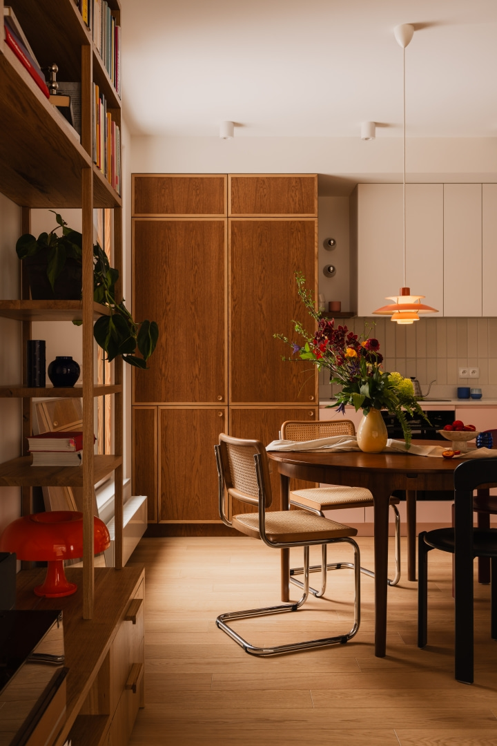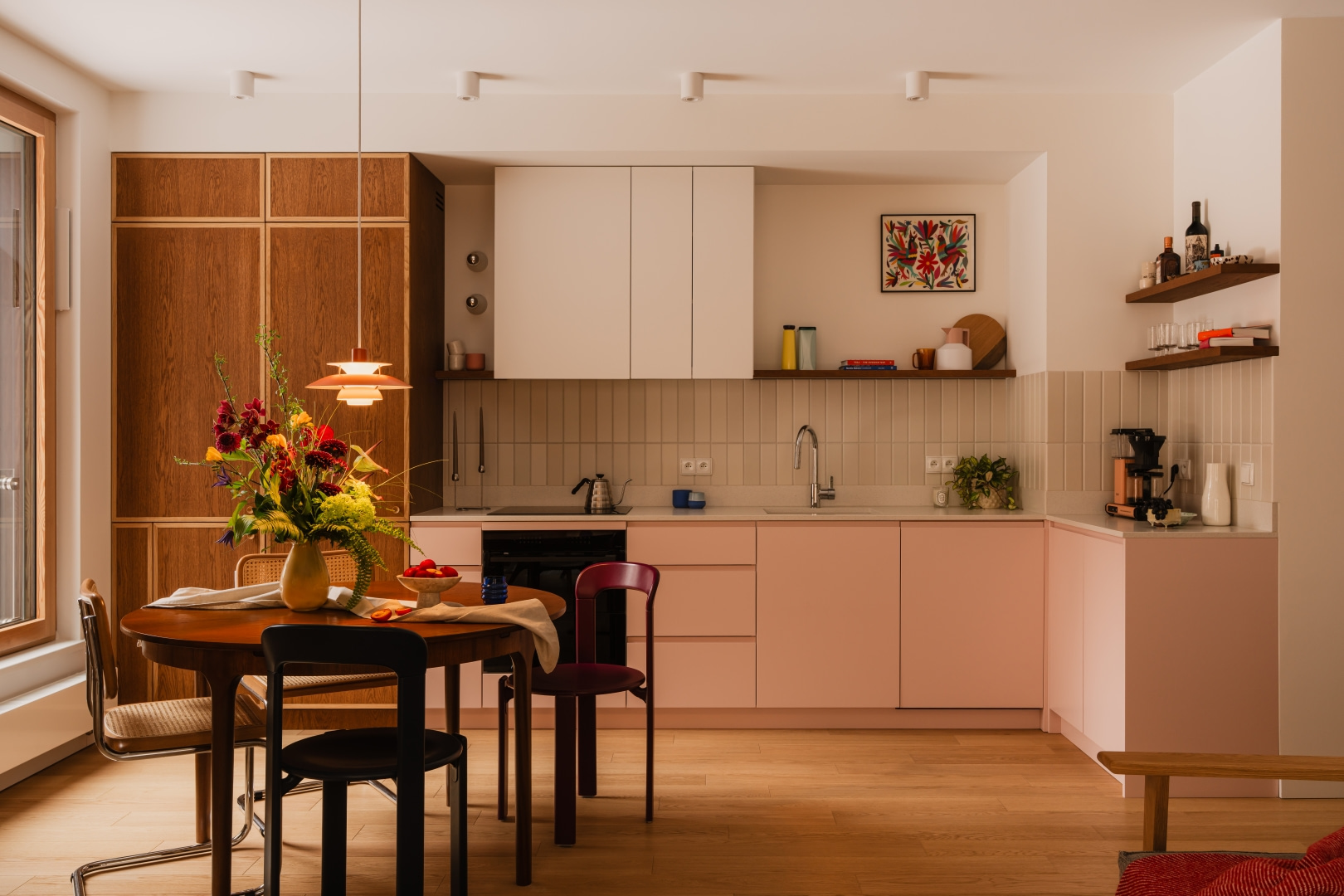 Kameralne, gdańskie osiedle, otoczone zielenią lasów Trójmiejskiego Parku Krajobrazowego stało się azylem młodego małżeństwa. Estetyka wnętrza łączy wpływy vintage z kopenhaską elegancją i swobodą. Proste, zaprojektowane na wymiar zabudowy stolarskie współgrają z designerskimi dodatkami i przedmiotami o wartości sentymentalnej. Naturalne drewno, stonowane barwy z mocniejszymi akcentami koloru i dopracowane detale tworzą tło dla codziennego życia. Kuchnia z różową zabudową i stołem z lat 60. stanowi przyjazne centrum domu, a salon z dębowym regałem sprzyja odpoczynkowi i codziennym rytuałom. Duże okno otwiera przestrzeń na las, wprowadzając kojące światło. Całość jest harmonijna, funkcjonalna i gotowa, by stopniowo wypełniać się osobistymi historiami właścicieli.