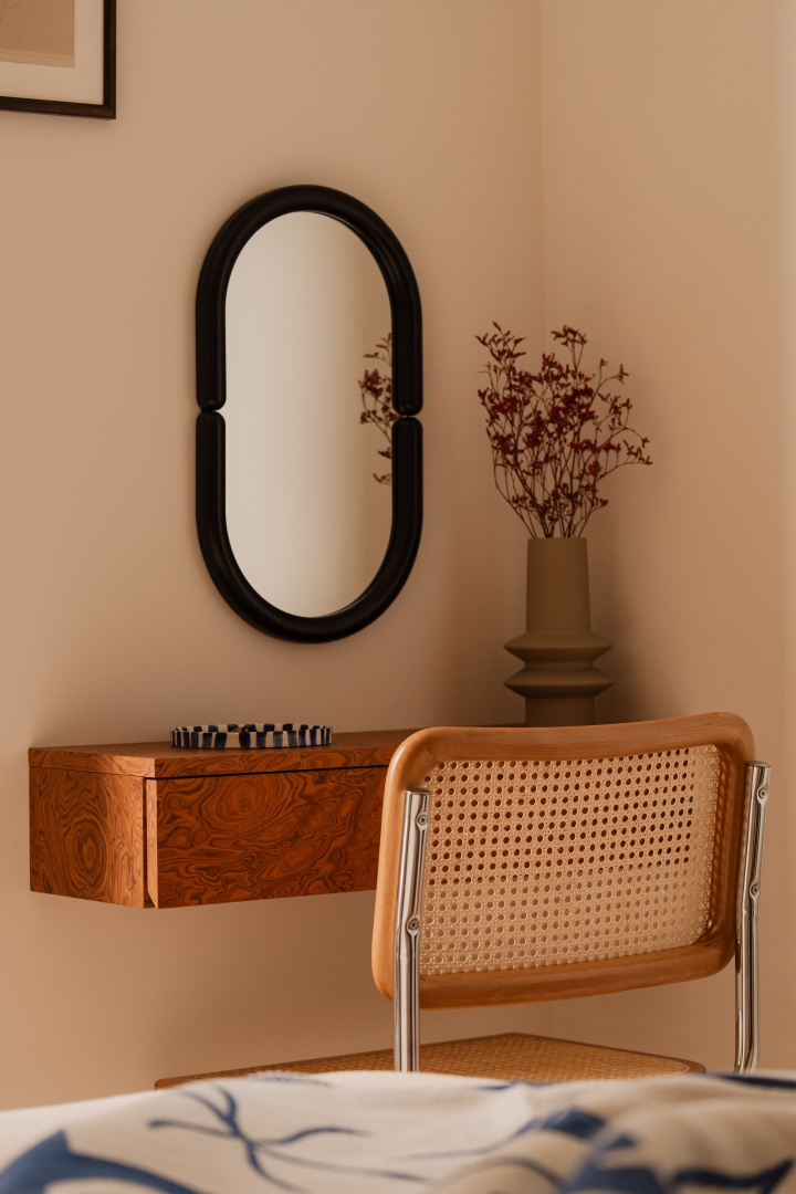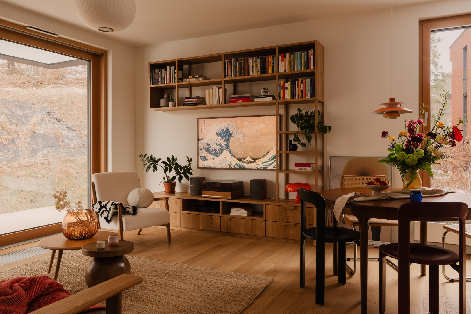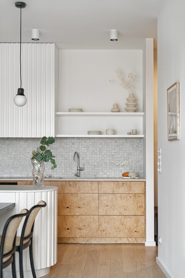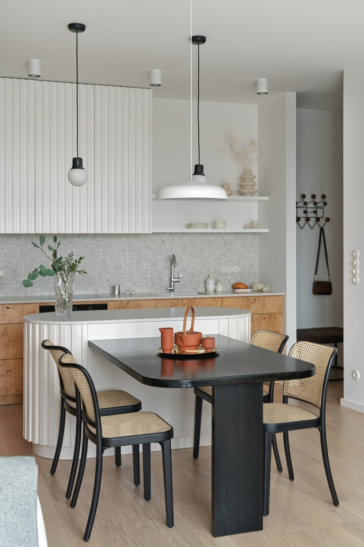 Kameralne, gdańskie osiedle, otoczone zielenią lasów Trójmiejskiego Parku Krajobrazowego stało się azylem młodego małżeństwa. Estetyka wnętrza łączy wpływy vintage z kopenhaską elegancją i swobodą. Proste, zaprojektowane na wymiar zabudowy stolarskie współgrają z designerskimi dodatkami i przedmiotami o wartości sentymentalnej. Naturalne drewno, stonowane barwy z mocniejszymi akcentami koloru i dopracowane detale tworzą tło dla codziennego życia. Kuchnia z różową zabudową i stołem z lat 60. stanowi przyjazne centrum domu, a salon z dębowym regałem sprzyja odpoczynkowi i codziennym rytuałom. Duże okno otwiera przestrzeń na las, wprowadzając kojące światło. Całość jest harmonijna, funkcjonalna i gotowa, by stopniowo wypełniać się osobistymi historiami właścicieli.