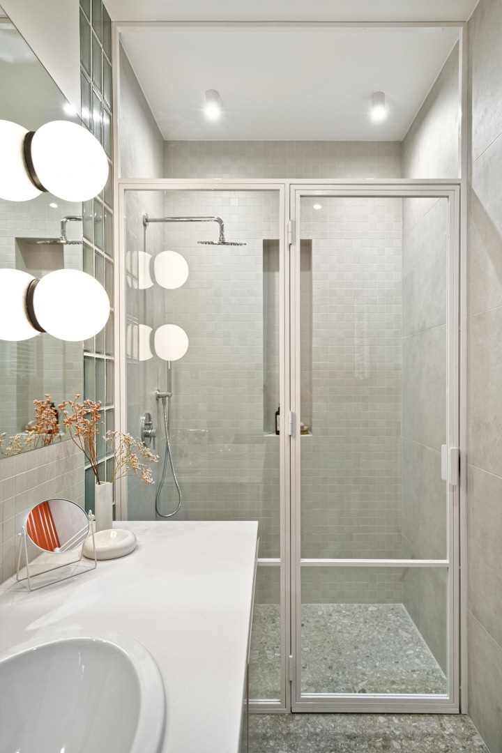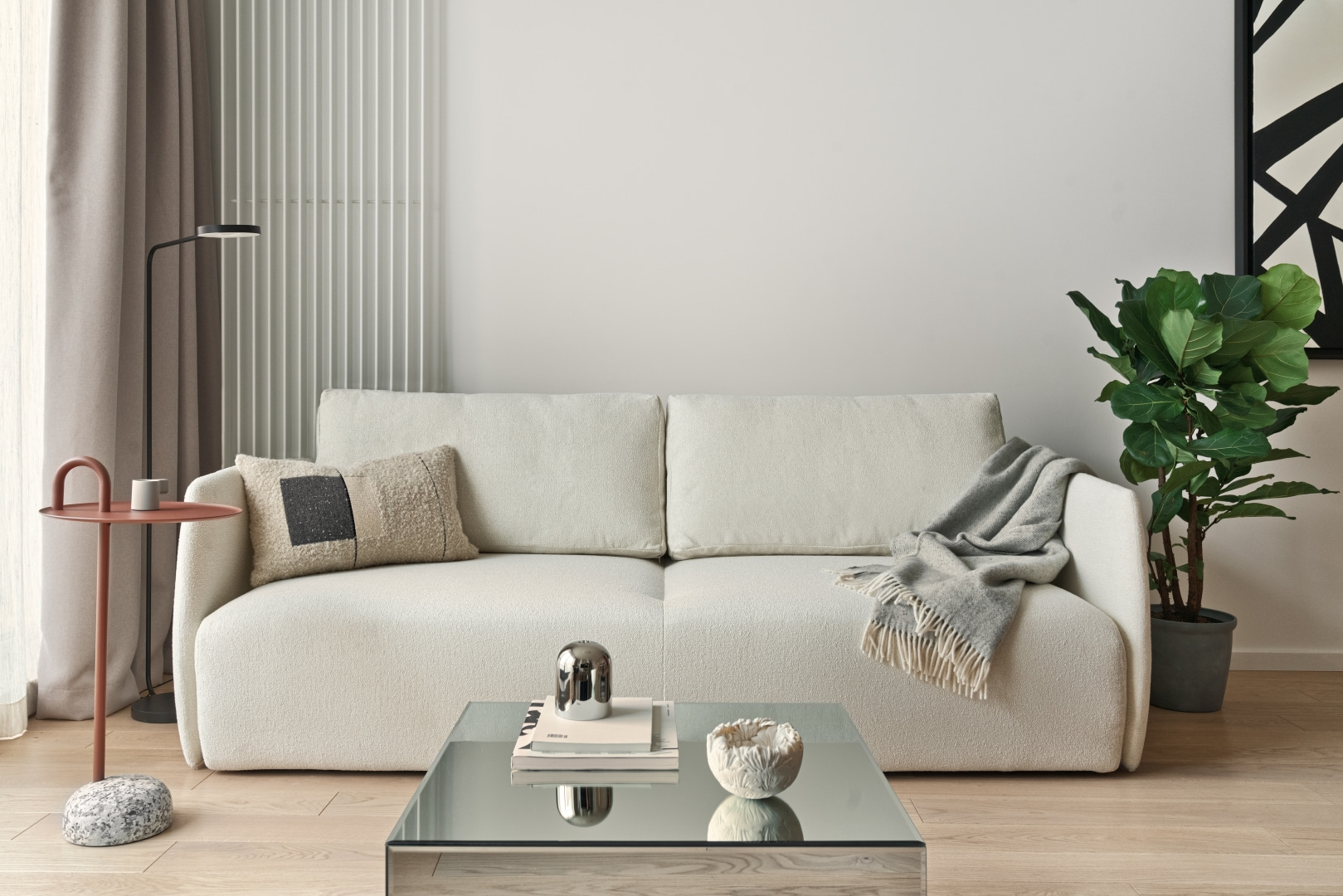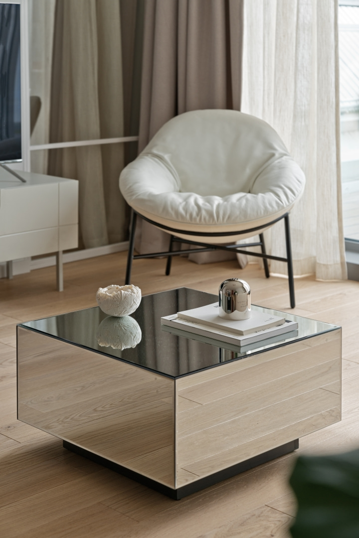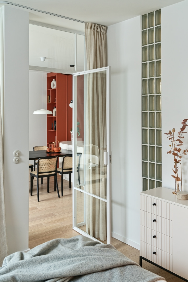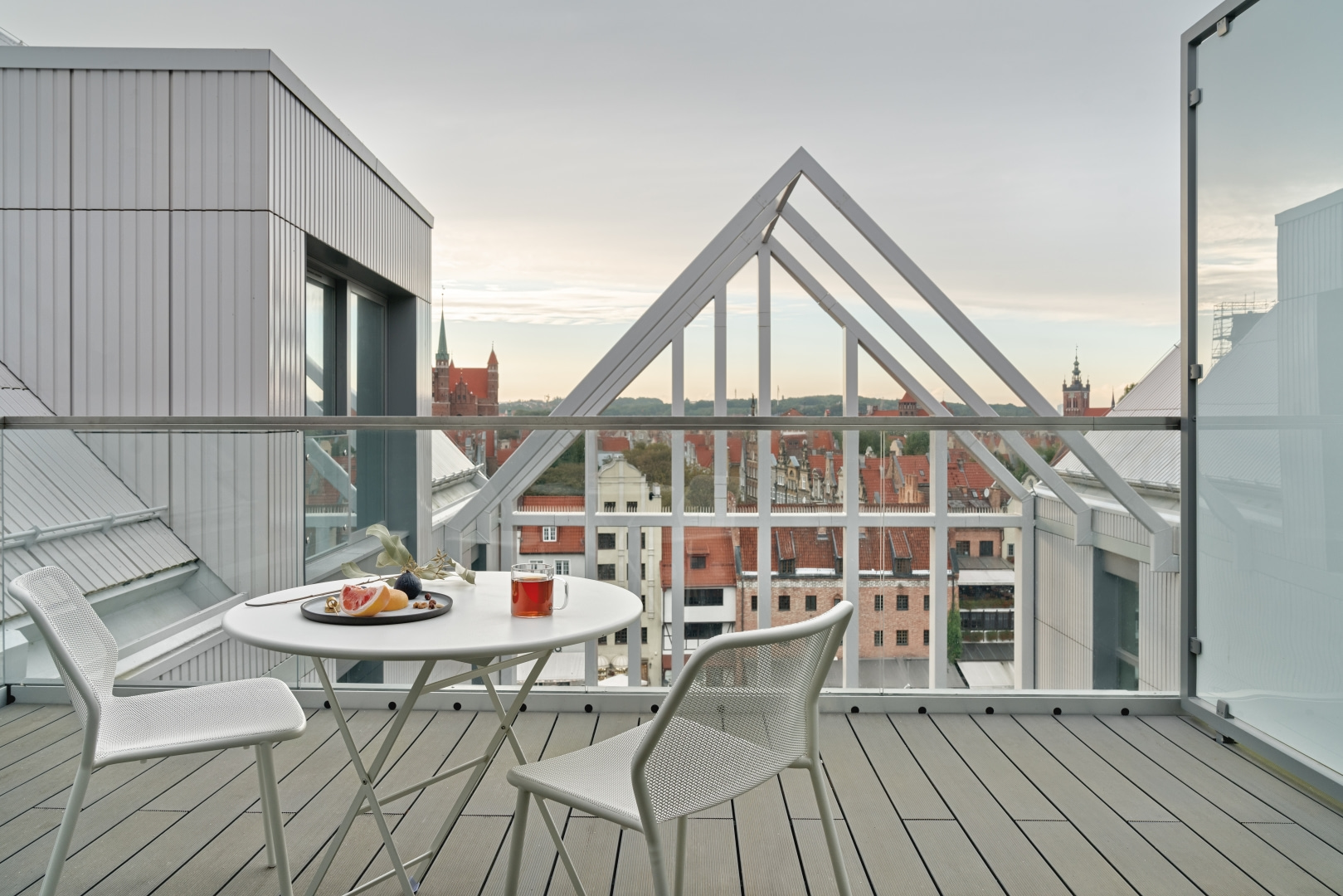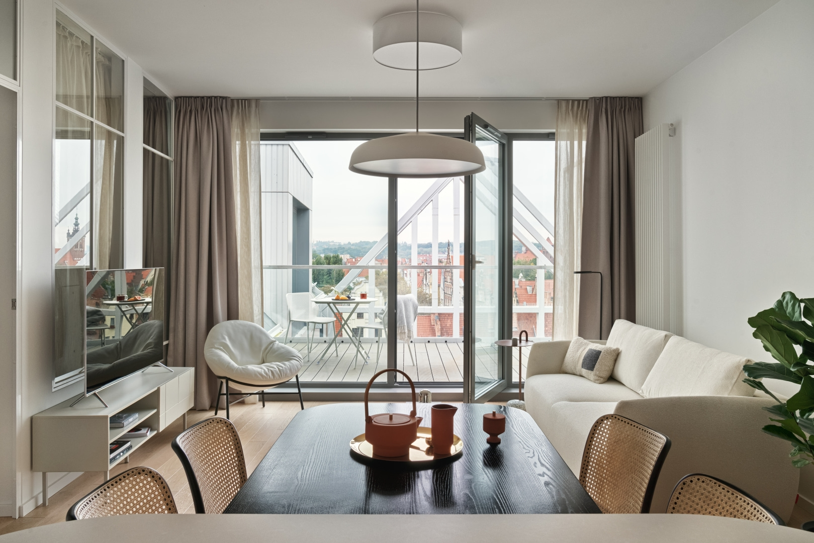 Mieszkanie zachwyca widokiem na gdańską Starówkę, Motławę i skąpane w słońcu kamieniczki. Wnętrze składające się z salonu z aneksem kuchennym, sypialni, łazienki i korytarza zaprojektowano z myślą o ponadczasowym uroku opierającym się mijającym modom. Serce strefy dziennej stanowi kremowa kuchnia z dekoracyjną wyspą, czeczotowym fornirem i terakotową zabudową, nawiązującą do dachówek widocznych za oknem. Podział pomiędzy częścią kuchenno-jadalnianą a wypoczynkową podkreśla przylegający do wyspy czarny, drewniany stół. Salon oddziela od sypialni ściana z przeszkleniami, dzięki którym przestrzeń wydaje się większa. Charakterystyczny pas luksferów w sypialni subtelnie doświetla łazienkę, gdzie królują biele, kremy i szlachetne terazzo.