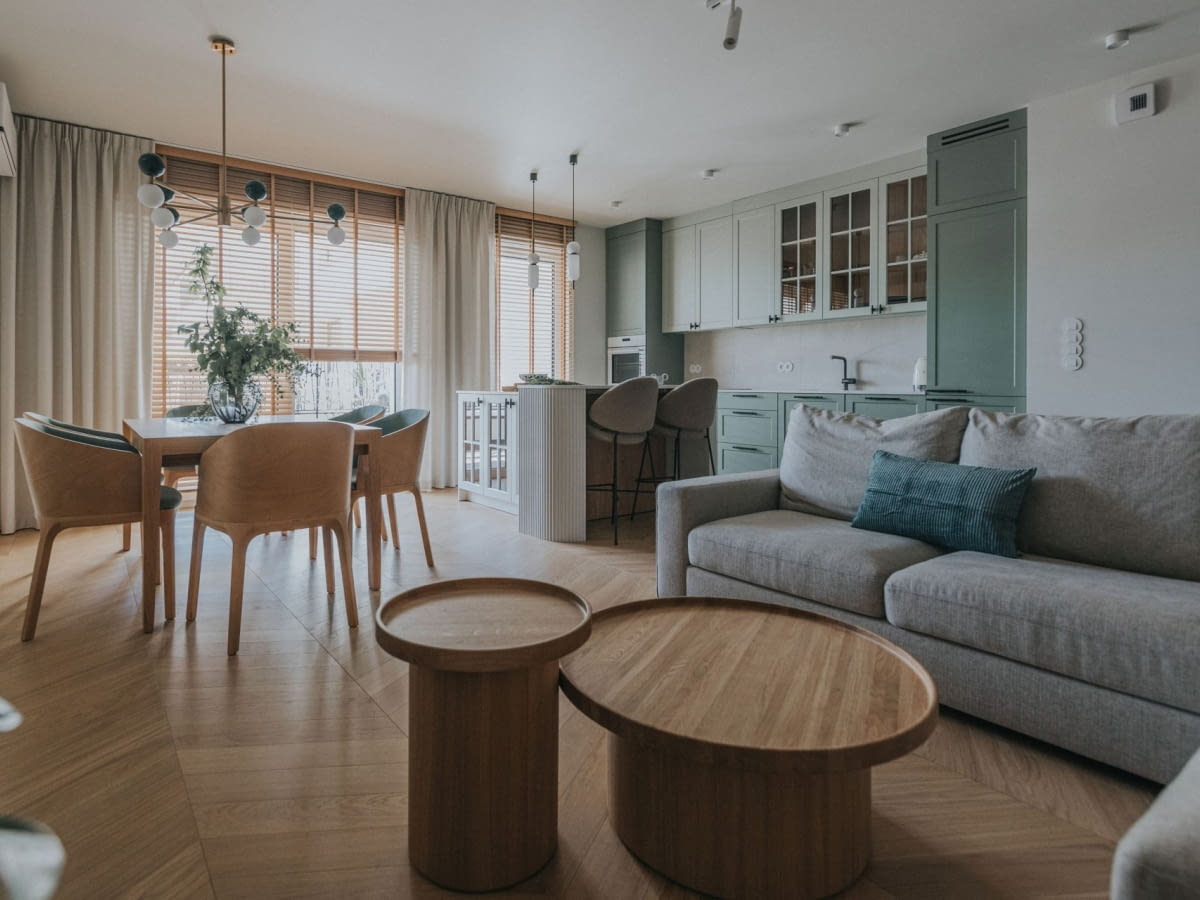 Motywem przewodnim aranżacji stała się zieleń, obecna zarówno w akcentach kolorystycznych, jak i w strukturach ścian pokrytych tynkiem o delikatnej fakturze. Aby podkreślić "płynność" przestrzeni, architekci zrezygnowali z części ścianek działowych, otwierając salon na kuchnię i jadalnię. Dzięki temu południowe światło swobodnie przenika przez balkon i zielony dziedziniec z platanami.