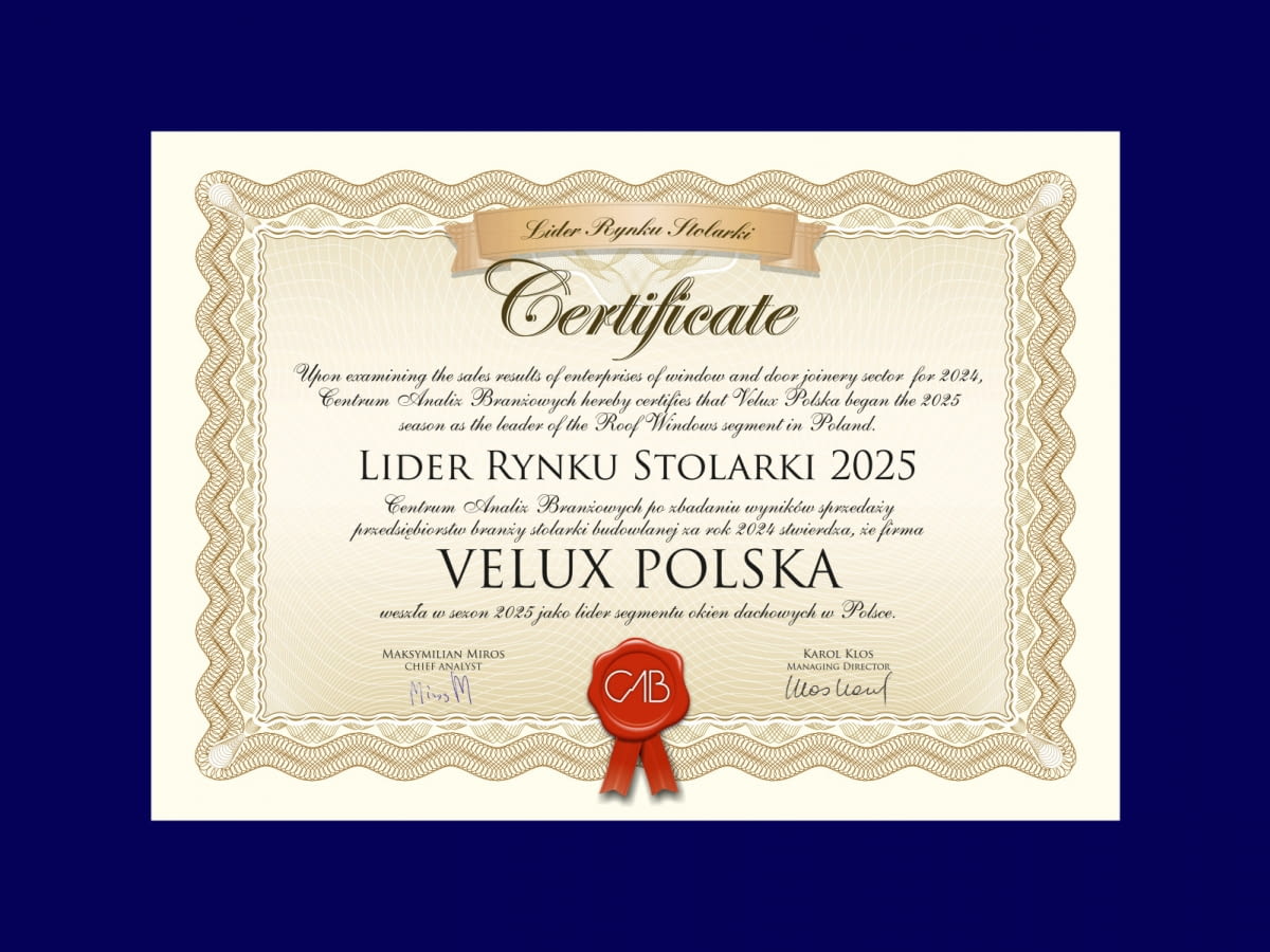 Firma VELUX Polska, od 35 lat obecna na polskim rynku stolarki budowlanej, po raz kolejny znalazła się w gronie najlepszych, zdobywając prestiżowe wyróżnienie Lider Rynku Stolarki 2025. Tytuł przyznawany jest na podstawie danych rynkowych i wyników sprzedażowych za rok poprzedni, opracowanych przez Centrum Analiz Branżowych (CAB).