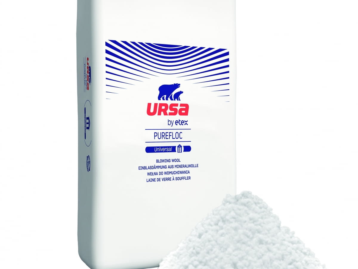 URSA PUREFLOC to innowacyjna izolacja z białej wełny mineralnej do wdmuchiwania, zapewniająca komfort cieplny i akustyczny oraz oszczędność energii do 30–60% (badanie wewnętrzne).