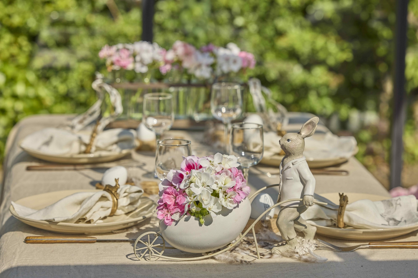 Ciekawym elementem dekoracji może być również figurka zająca pchającego taczkę wypełnioną białymi i różowymi pelargoniami. W połączeniu z kwiatowymi aranżacjami tworzy ona lekką, radosną kompozycję, która przyciąga wzrok gości i podkreśla wielkanocny charakter stołu.