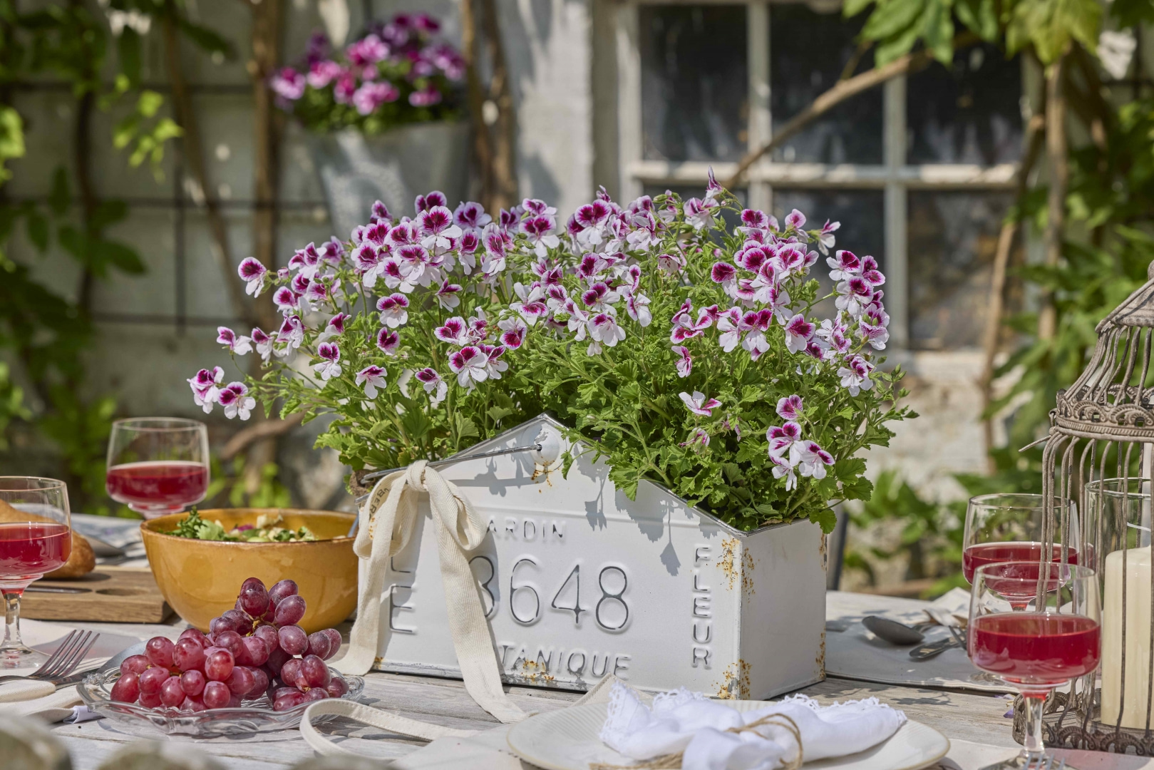 Wielkanocny stół z pelargoniami w stylu rustykalnym i vintage