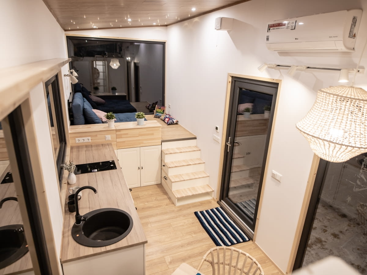 Podstawowym założeniem projektowania wnętrza małego domu na kółkach jest stworzenie logicznego podziału przestrzeni. Zamiast wielu osobnych pomieszczeń, mamy do czynienia z jedną otwartą strefą, którą należy podzielić na mniejsze funkcje. Najczęściej kuchnia łączy się z salonem, który pełni też funkcję jadalni i sypialni. Wydzielenie stref odbywa się za pomocą różnic w poziomach podłogi, zastosowania mebli modułowych czy różnych materiałów wykończeniowych. Dzięki temu wnętrze zachowuje spójność, a jednocześnie zapewnia komfortowe warunki życia.
