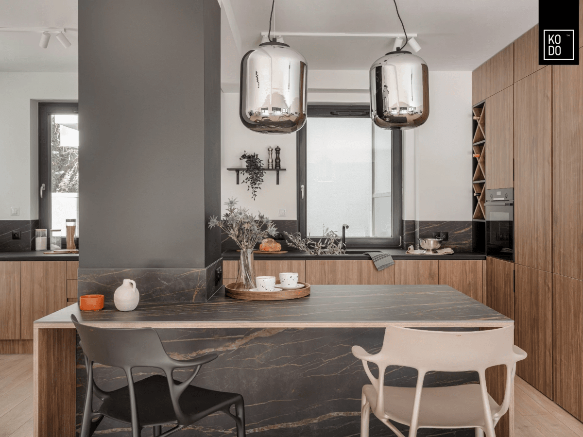 Estetyka wnętrza stanowi połączenie współczesnych trendów z klasyczną elegancją. W strefie dziennej dominują proste formy oraz naturalne materiały, które tworzą spójną, stonowaną kompozycję.