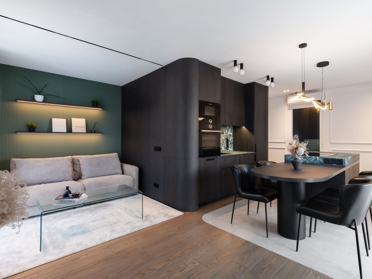 Salon, kuchnia, jadalnia, sypialnia i łazienka "tworzą jedną historię" – wszędzie pojawiają się te same motywy: zieleń, czerń, drewno, ciepłe światło. Dzięki temu wystrój tego mieszkania nie jest zlepkiem osobnych stylistyk, tylko konsekwentnie poprowadzoną aranżacją.