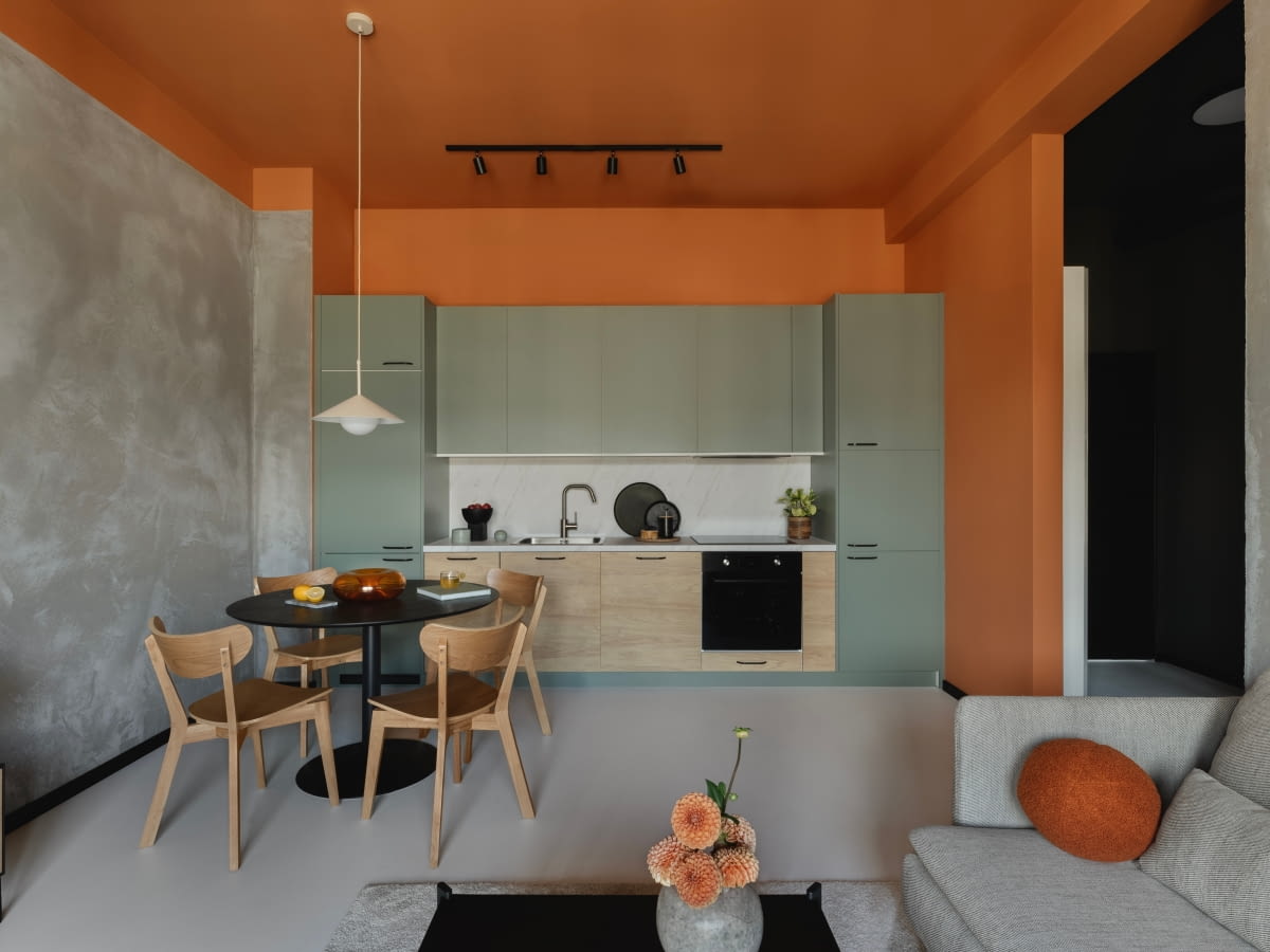 Zaglądamy do niewielkiego mieszkania z jedną sypialnią, gdzie uwagę najbardziej przykuwa... pomarańczowy sufit. Do tego jasnoszara podłoga, meble kuchenne w kolorze szałwii oraz ściana z luksferów między pomieszczeniami, która doświetla przestrzeń i w ciekawy sposób zastępuje dekoracje.
