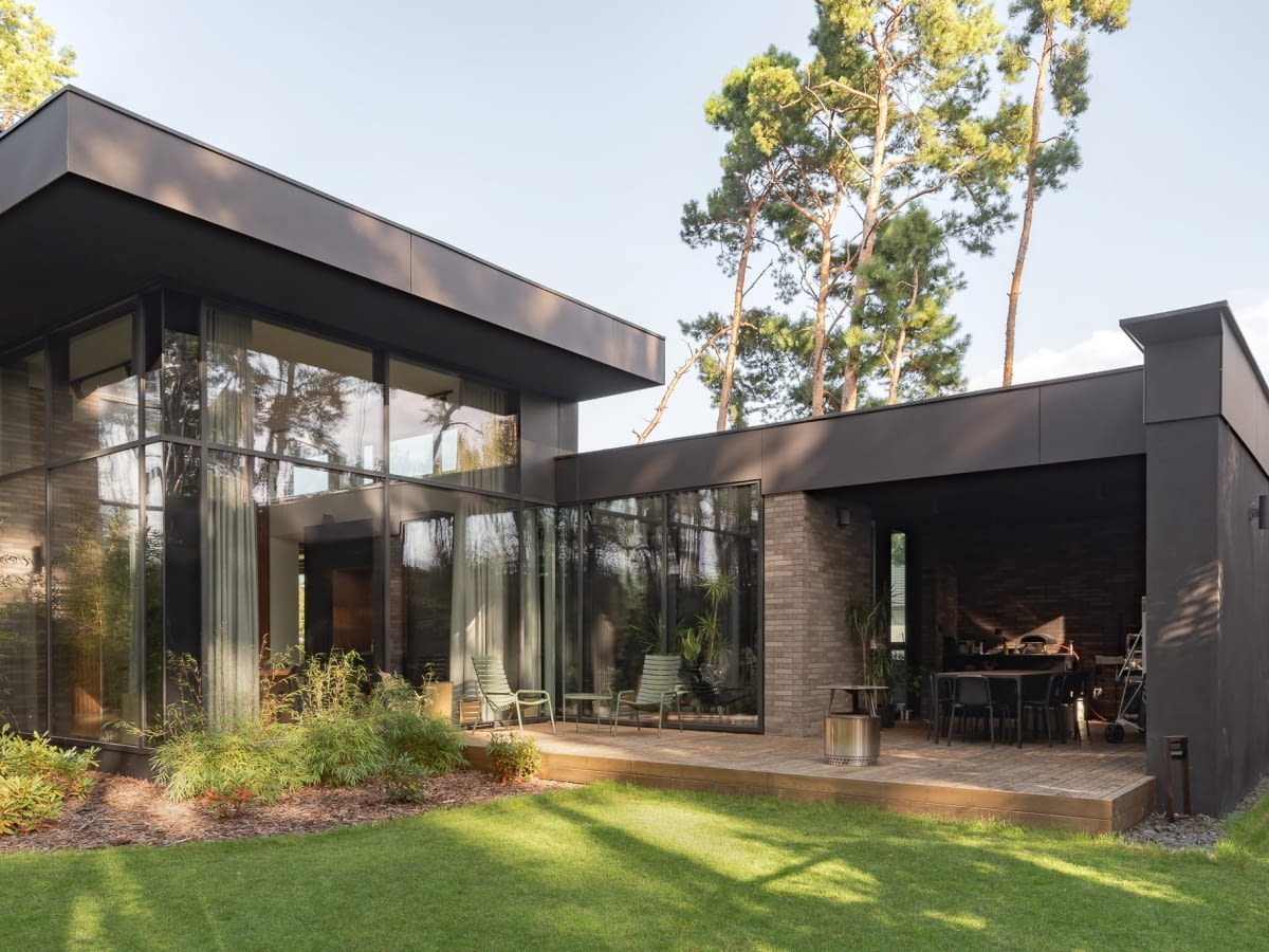 Naturalne zacienienie zapewniane przez wysokie sosny umożliwiło zastosowanie rozległych przeszkleń. Duże okna otwierają wnętrza na krajobraz, zapewniając jednocześnie odpowiedni komfort termiczny. Dobór materiałów elewacyjnych podporządkowano idei integracji z otoczeniem — ich kolorystyka i faktura nawiązują do rytmu i tonacji leśnego krajobrazu.