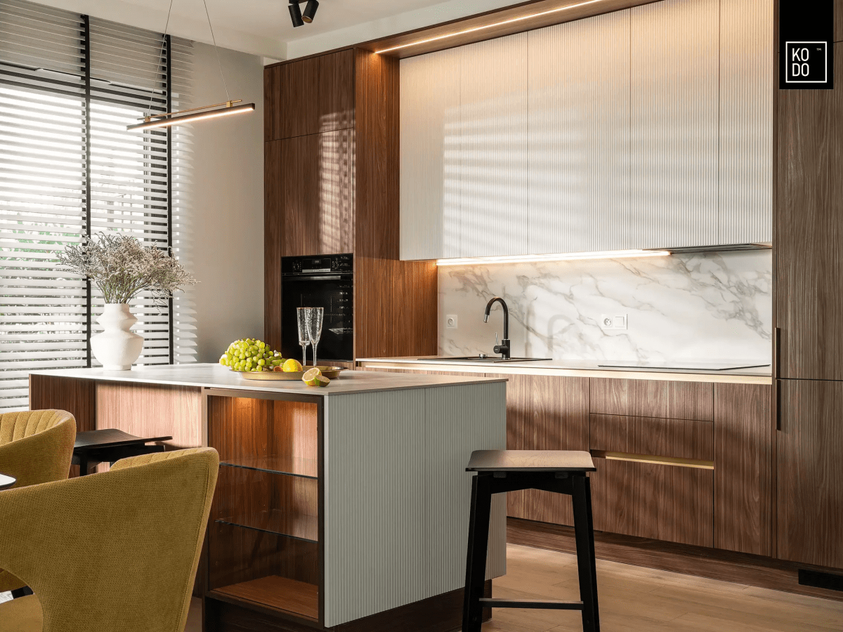 Sercem mieszkania jest strefa dzienna, w której kuchnia i salon tworzą jeden wspólny organizm. Takie rozwiązanie nie jest przypadkowe – wynika z głębokiego zrozumienia rytmu życia rodziny. Centrum tej przestrzeni stanowi kuchenna wyspa, łącząca praktyczność z estetyką. Frezowania, podświetlana gablota, pojemne szuflady – każdy detal jest przemyślany, a mimo to całość sprawia wrażenie lekkiej i naturalnej.