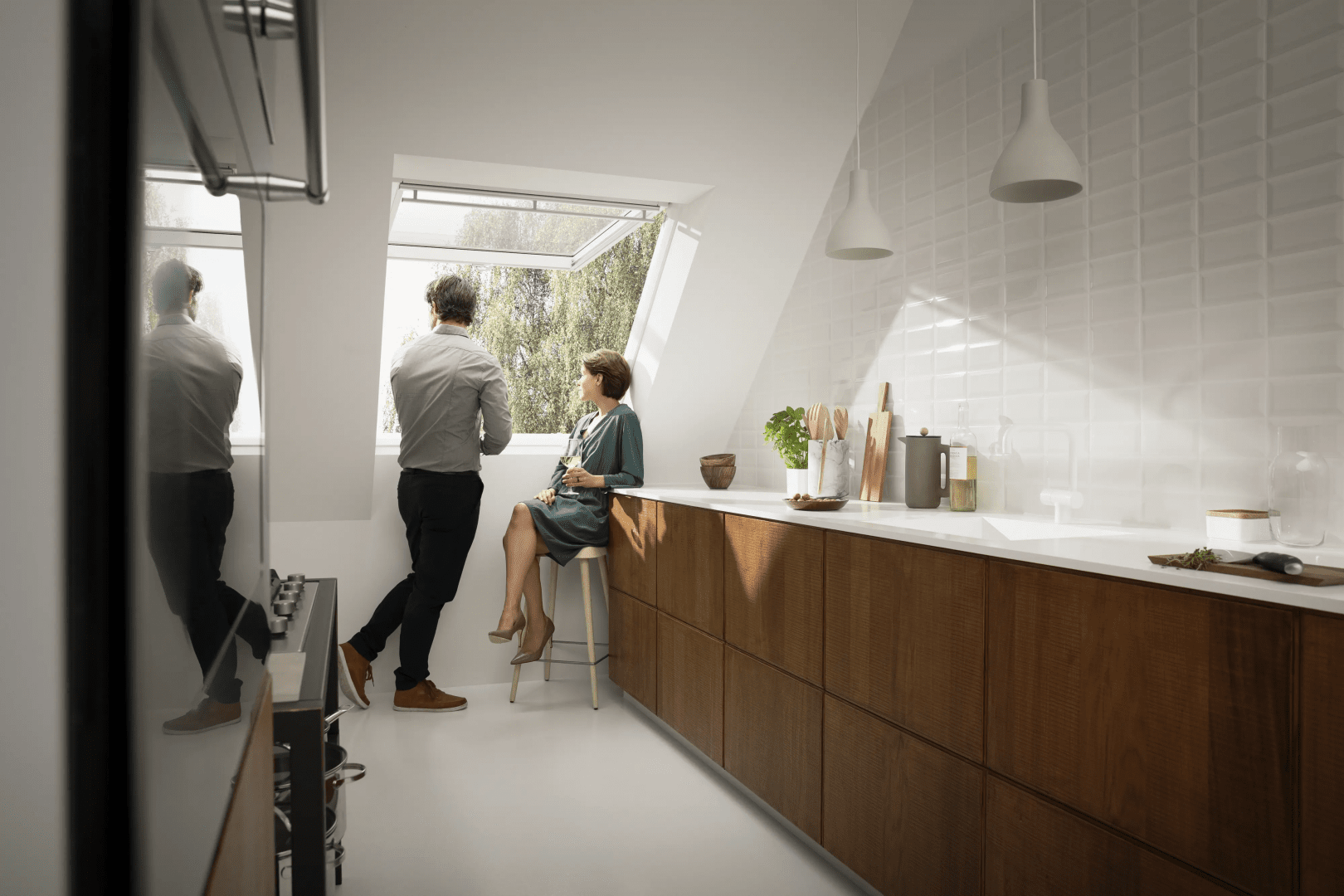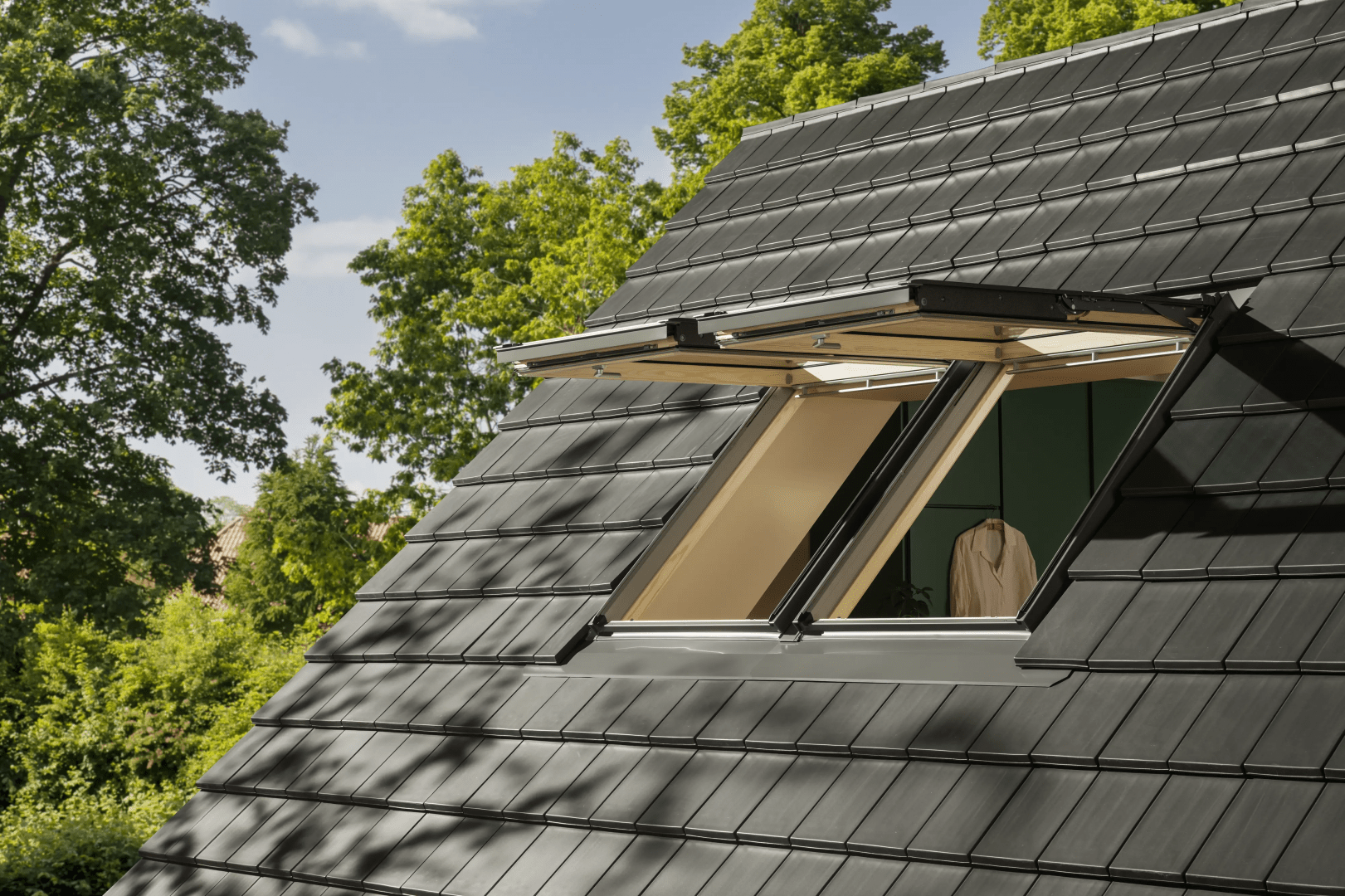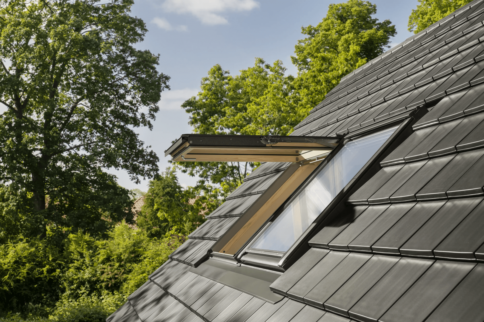 Okna elektryczne VELUX można wygodnie otwierać i zamykać za pomocą przycisku naściennego lub aplikacji mobilnej. Fabrycznie wbudowany czujnik deszczu automatycznie zamyka okno przy pierwszych kroplach, nawet gdy domownicy są poza domem. Dzięki niewidocznemu silnikowi oraz nowoczesnej szybie 64 z powłokami antyroszeniową i łatwozymwalną, okna elektryczne łączą estetykę, funkcjonalność i bardzo dobre parametry izolacyjne. Ułatwiają regularną wentylację, wspierają zdrowy klimat wewnątrz pomieszczeń i są gotowe do integracji z systemami inteligentnego domu.