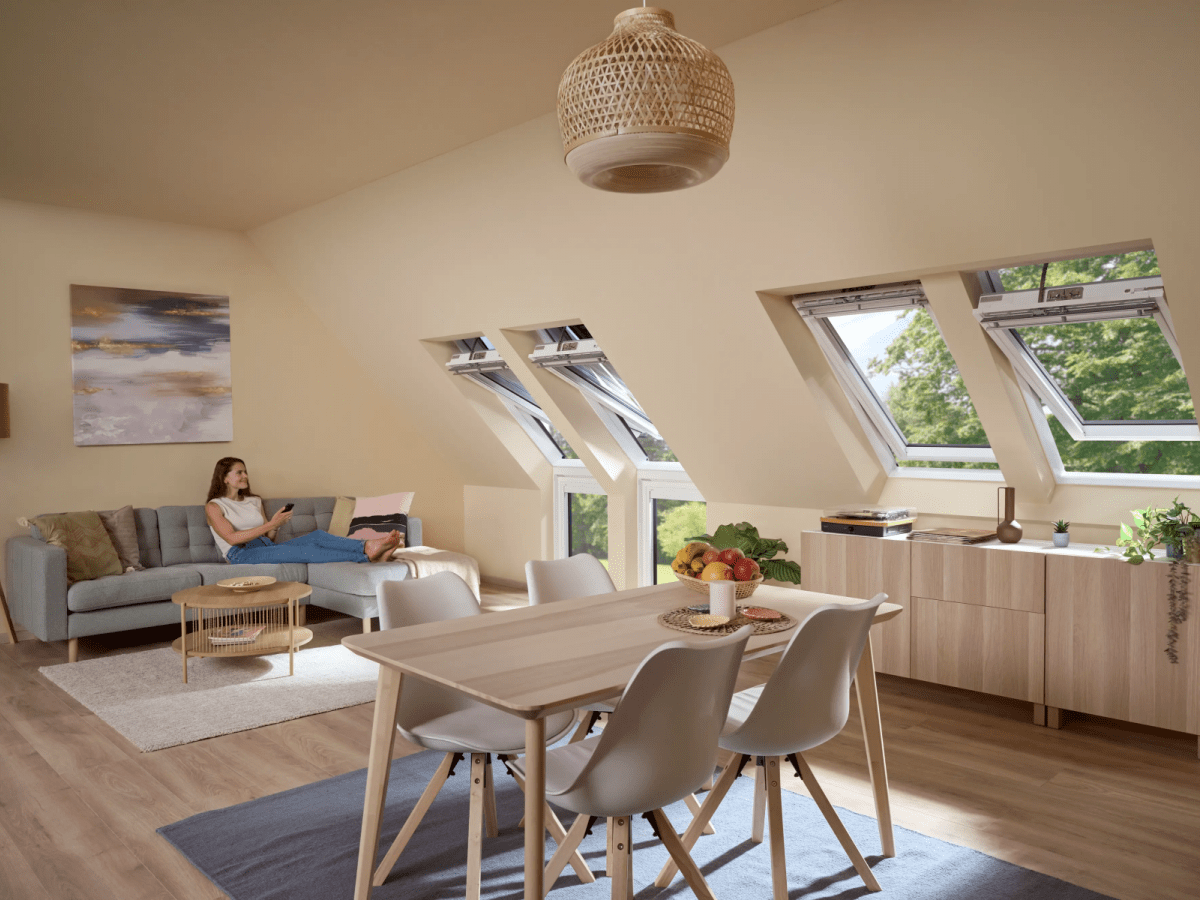 Okna elektryczne VELUX można wygodnie otwierać i zamykać za pomocą przycisku naściennego lub aplikacji mobilnej. Fabrycznie wbudowany czujnik deszczu automatycznie zamyka okno przy pierwszych kroplach, nawet gdy domownicy są poza domem. Dzięki niewidocznemu silnikowi oraz nowoczesnej szybie 64 z powłokami antyroszeniową i łatwozymwalną, okna elektryczne łączą estetykę, funkcjonalność i bardzo dobre parametry izolacyjne. Ułatwiają regularną wentylację, wspierają zdrowy klimat wewnątrz pomieszczeń i są gotowe do integracji z systemami inteligentnego domu.